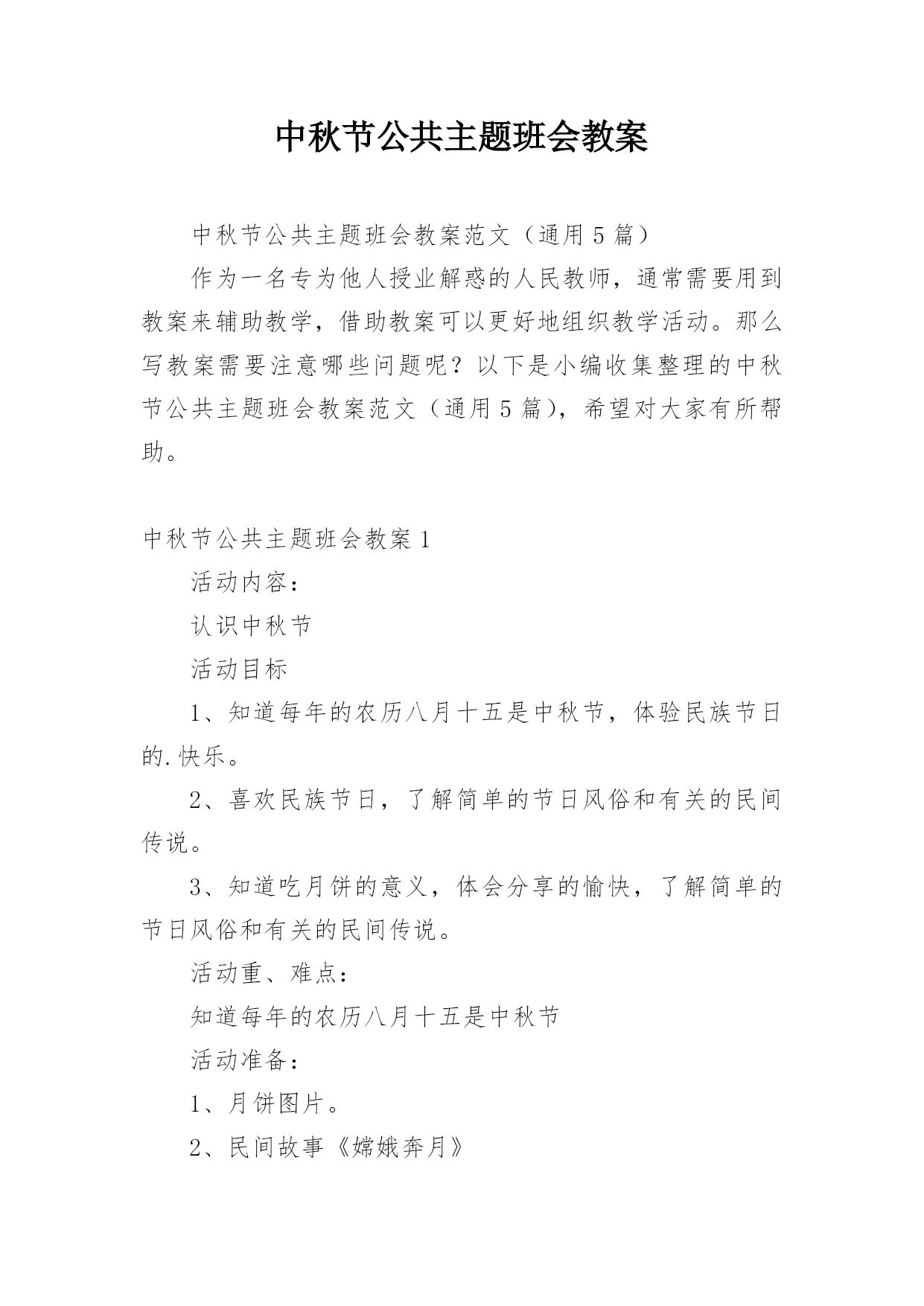 中秋节公共主题班会教案中秋节公共主题班会教案范文(通用5篇)作为一名专为他人授业解惑的人民教师,通常需要用到教案来辅助教学,借助教案可以更好地组织教学活动。那么写教案需要注意哪些问题呢?以下是小编收集整理的中秋节公共主题班会教案范文(通用5篇),希望对大家有所帮助。中秋节公共主题班会教案1活动内容:认识中秋节活动目标1、知道每年的农历八月十五是中秋节,体验民族节日的.快乐。2、喜欢民族节日,了解简单的节日风俗和有关的民间传说。3、知道吃月饼的意义,体会分享的愉快,了解简单的节日风俗和有关的民间传说。活动重