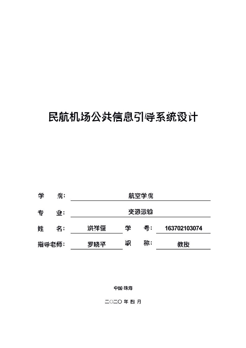 ⺠航机场公共信息引导系统设计学院:航空学院专业:交通运输姓名:洪祥恒学号:163702103074指导⽼师:罗晓平职称:教授中国·珠海⼆○⼆〇年四⽉北京理⼯⼤学珠海学院2020届本科⽣毕业论⽂诚信承诺书本⼈郑重承诺:我所呈交的毕业论⽂《⺠航机场公共信息引导系统设计》是在指导教师的指导下,独⽴开展研究取得的成果,⽂中引⽤他⼈的观点和材料,均在⽂后按顺序列出其参考⽂献,论⽂使⽤的数据真实可靠。承诺⼈签名:洪祥恒⽇期:2020年4⽉8⽇北京理⼯⼤学珠海学院2020届本科⽣毕业论⽂⺠航机场公共信息引导系统设计摘要