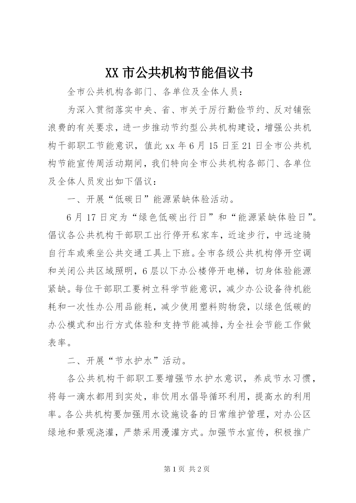 第PAGE\*Arabic\*MERGEFORMAT2页共NUMPAGES\*MERGEFORMAT2页XX市公共机构节能倡议书全市公共机构各部门、各单位及全体人员:为深入贯彻落实中央、省、市关于厉行勤俭节约、反对铺张浪费的有关要求,进一步推动节约型公共机构建设,增强公共机构干部职工节能意识,值此xx年6月15日至21日全市公共机构节能宣传周活动期间,我们特向全市公共机构各部门、各单位及全体人员发出如下倡议:一、开展“低碳日”能源紧缺体验活动。6月17日定为“绿色低碳出行日”和“能源紧缺体验日