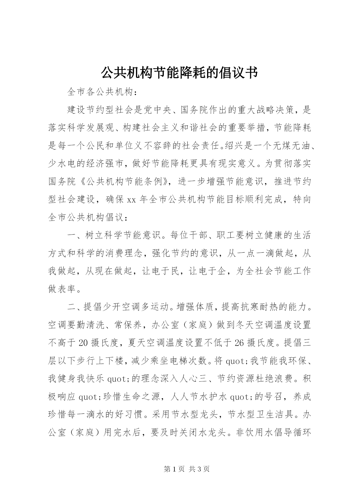 第PAGE\*Arabic\*MERGEFORMAT3页共NUMPAGES\*MERGEFORMAT3页公共机构节能降耗的倡议书全市各公共机构:建设节约型社会是党中央、国务院作出的重大战略决策,是落实科学发展观、构建社会主义和谐社会的重要举措,节能降耗是每一个公民和单位义不容辞的社会责任。绍兴是一个无煤无油、少水电的经济强市,做好节能降耗更具有现实意义。为贯彻落实国务院《公共机构节能条例》,进一步增强节能意识,推进节约型社会建设,确保xx年全市公共机构节能目标顺利完成,特向全市公共机构倡议:一