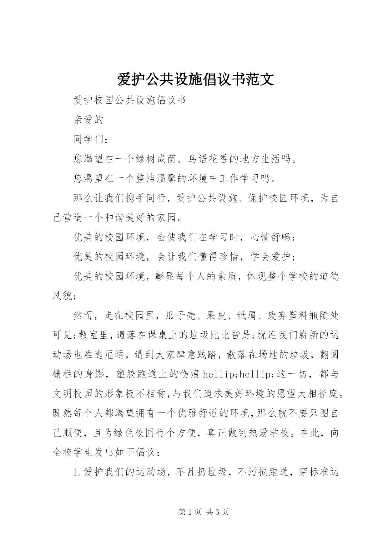 第PAGE\*Arabic\*MERGEFORMAT3页共NUMPAGES\*MERGEFORMAT3页爱护公共设施倡议书范文爱护校园公共设施倡议书亲爱的同学们:您渴望在一个绿树成荫、鸟语花香的地方生活吗。您渴望在一个整洁温馨的环境中工作学习吗。那么让我们携手同行,爱护公共设施、保护校园环境,为自己营造一个和谐美好的家园。优美的校园环境,会使我们在学习时,心情舒畅;优美的校园环境,会让我们懂得珍惜,学会爱护;优美的校园环境,彰显每个人的素质,体现整个学校的道德风貌;然而,走在校园里,瓜子壳、果