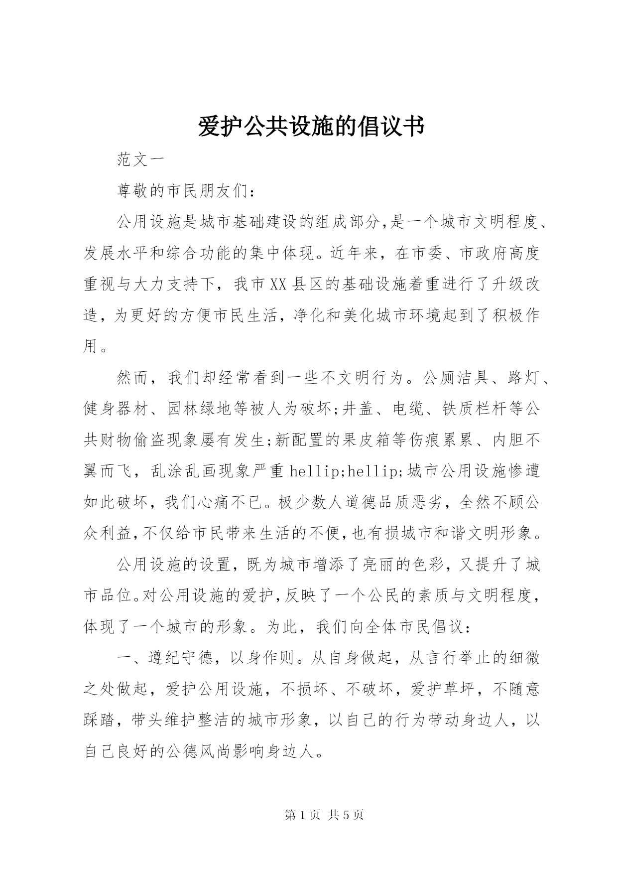 第PAGE\*Arabic\*MERGEFORMAT5页共NUMPAGES\*MERGEFORMAT5页爱护公共设施的倡议书范文一尊敬的市民朋友们:公用设施是城市基础建设的组成部分,是一个城市文明程度、发展水平和综合功能的集中体现。近年来,在市委、市政府高度重视与大力支持下,我市XX县区的基础设施着重进行了升级改造,为更好的方便市民生活,净化和美化城市环境起到了积极作用。然而,我们却经常看到一些不文明行为。公厕洁具、路灯、健身器材、园林绿地等被人为破坏;井盖、电缆、铁质栏杆等公共财物偷盗现象屡