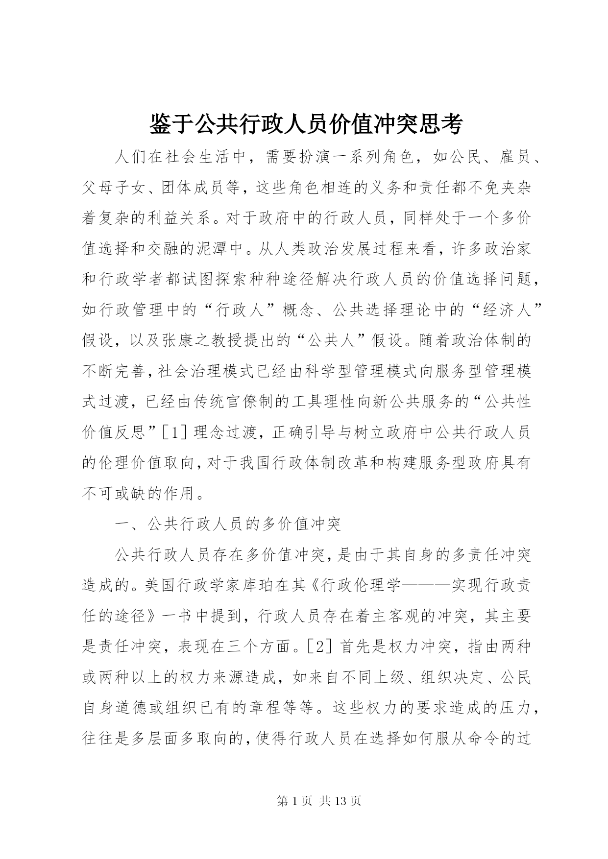 第PAGE\*Arabic\*MERGEFORMAT13页共NUMPAGES\*MERGEFORMAT13页鉴于公共行政人员价值冲突思考人们在社会生活中,需要扮演一系列角色,如公民、雇员、父母子女、团体成员等,这些角色相连的义务和责任都不免夹杂着复杂的利益关系。对于政府中的行政人员,同样处于一个多价值选择和交融的泥潭中。从人类政治发展过程来看,许多政治家和行政学者都试图探索种种途径解决行政人员的价值选择问题,如行政管理中的“行政人”概念、公共选择理论中的“经济人”假设,以及张康之教授提出的“公