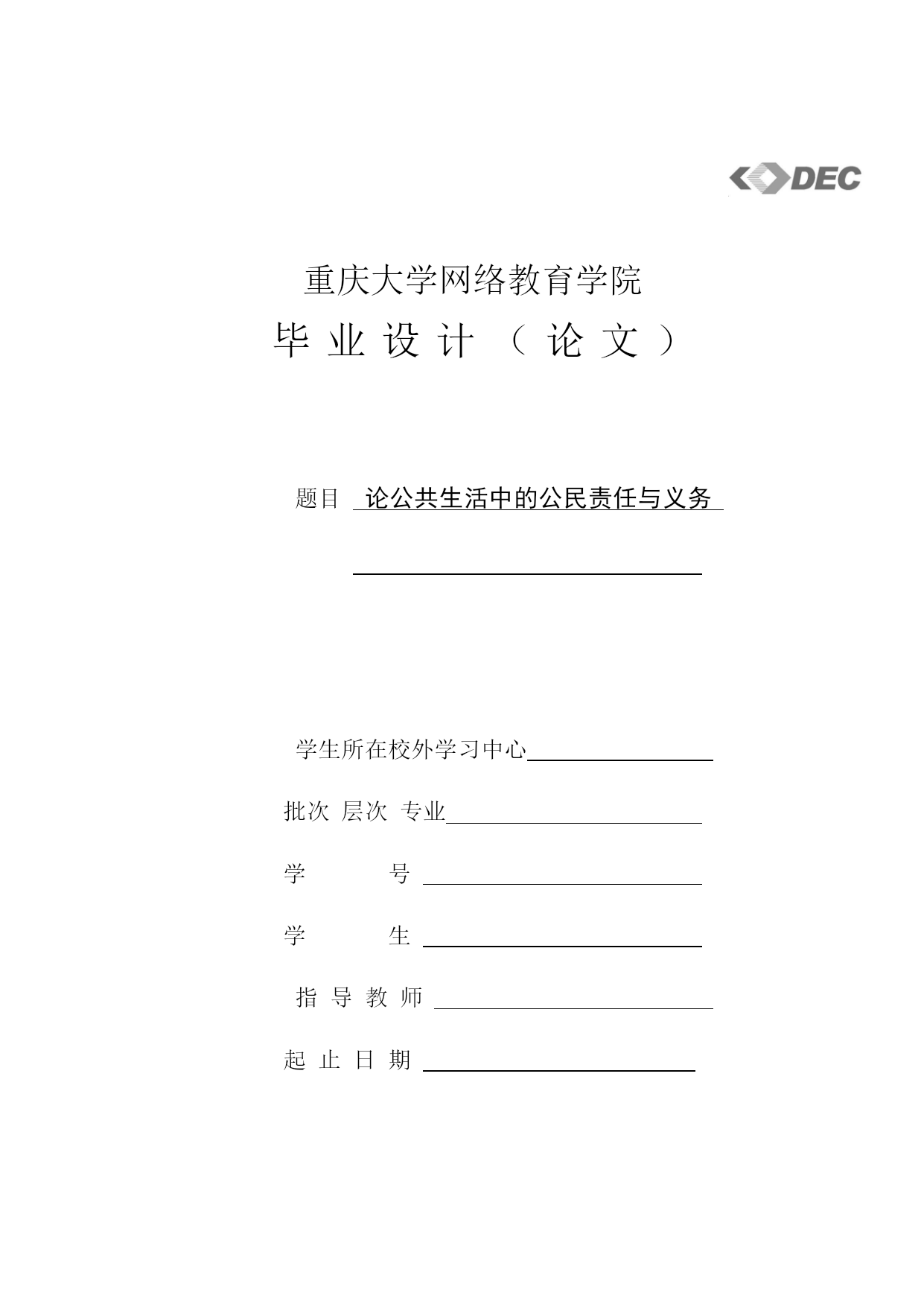 重庆大学网络教育学院毕业设计(论文)题目论公共生活中的公民责任与义务学生所在校外学习中心批次层次专业学号学生指导教师起止日期摘要写著《责任伦理》的著名作家约纳斯提出:现代伦理学的中心论题是责任论题。职责和义务在人们认为的道德中占主要部分。是一个所有公民都需要承担的社会责任,职责就是自己一定要做的事情,其中也包括了如果不做需要承担的惩罚和压力。职责和义务的界限和定义展现出了个人和他人与社会的联系,简单来说,职责包括了自身和别人的主观的辨别、规律和理论的社会性争辩、自身和担当的意识性辨别等多种定义,在进行分析