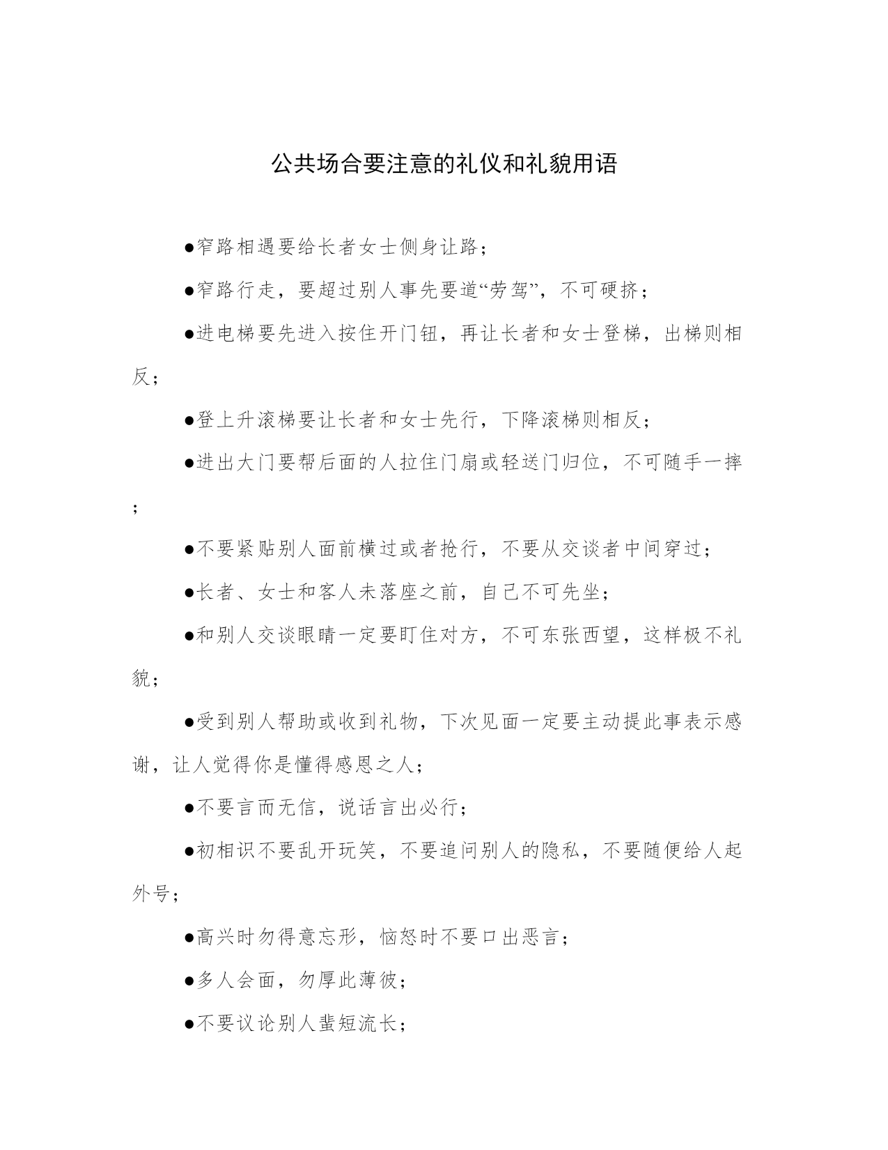 公共场合要注意的礼仪和礼貌用语●窄路相遇要给长者女士侧身让路;●窄路行走,要超过别人事先要道“劳驾”,不可硬挤;●进电梯要先进入按住开门钮,再让长者和女士登梯,出梯则相反;●登上升滚梯要让长者和女士先行,下降滚梯则相反;●进出大门要帮后面的人拉住门扇或轻送门归位,不可随手一摔;●不要紧贴别人面前横过或者抢行,不要从交谈者中间穿过;●长者、女士和客人未落座之前,自己不可先坐;●和别人交谈眼睛一定要盯住对方,不可东张西望,这样极不礼貌;●受到别人帮助或收到礼物,下次见面一定要主动提此事表示感谢,让人觉得你是懂