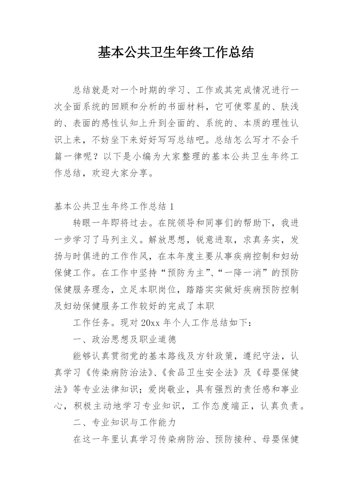 基本公共卫生年终工作总结总结就是对一个时期的学习、工作或其完成情况进行一次全面系统的回顾和分析的书面材料,它可使零星的、肤浅的、表面的感性认知上升到全面的、系统的、本质的理性认识上来,不妨坐下来好好写写总结吧。总结怎么写才不会千篇一律呢?以下是小编为大家整理的基本公共卫生年终工作总结,欢迎大家分享。基本公共卫生年终工作总结1转眼一年即将过去。在院领导和同事们的帮助下,我进一步学习了马列主义。解放思想,锐意进取,求真务实,发扬与时俱进的工作作风,在本年度主要从事疾病控制和妇幼保健工作。在工作中坚持“预防为主