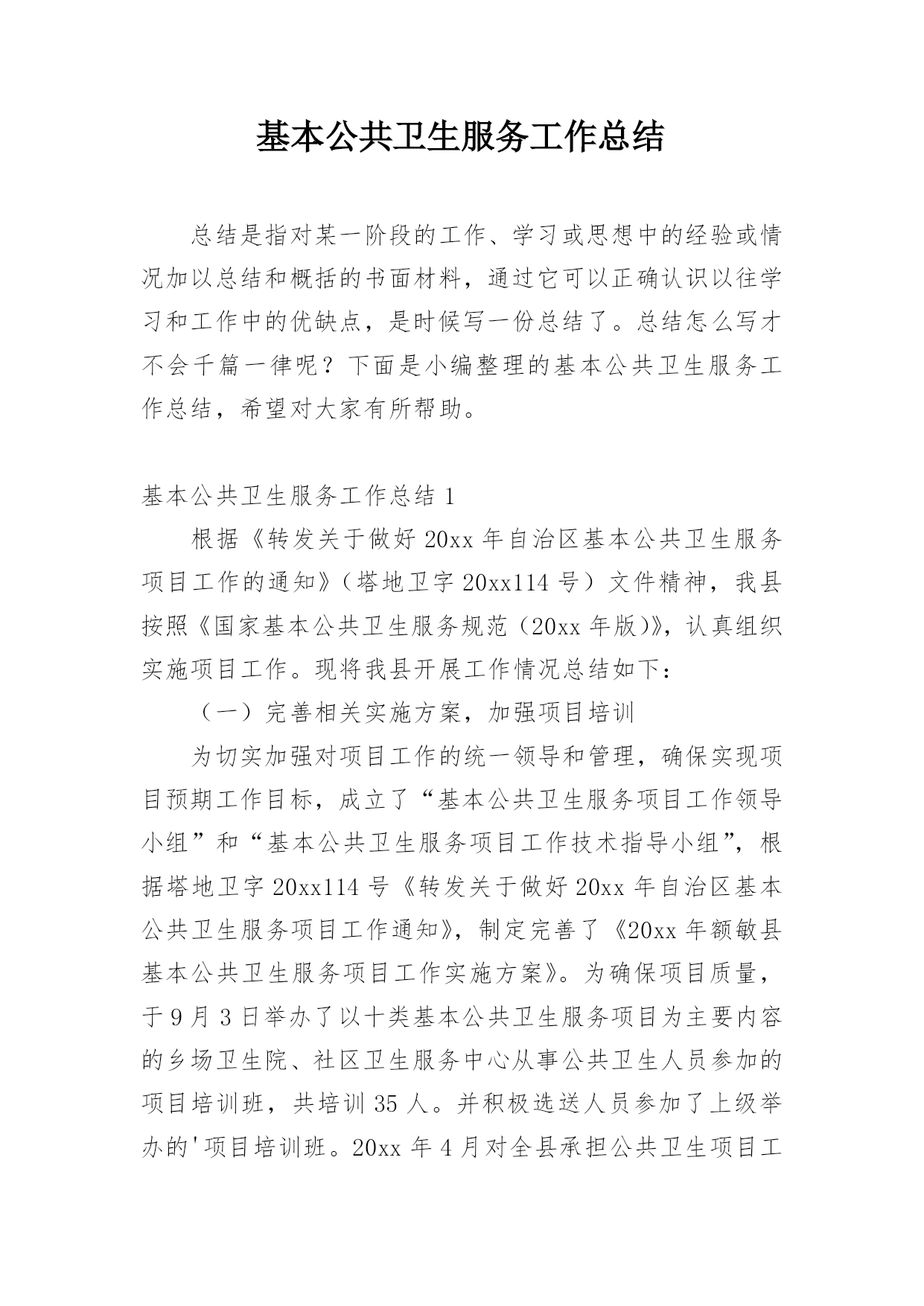 基本公共卫生服务工作总结总结是指对某一阶段的工作、学习或思想中的经验或情况加以总结和概括的书面材料,通过它可以正确认识以往学习和工作中的优缺点,是时候写一份总结了。总结怎么写才不会千篇一律呢?下面是小编整理的基本公共卫生服务工作总结,希望对大家有所帮助。基本公共卫生服务工作总结1根据《转发关于做好20xx年自治区基本公共卫生服务项目工作的通知》(塔地卫字20xx114号)文件精神,我县按照《国家基本公共卫生服务规范(20xx年版)》,认真组织实施项目工作。现将我县开展工作情况总结如下:(一)完善相关实施方