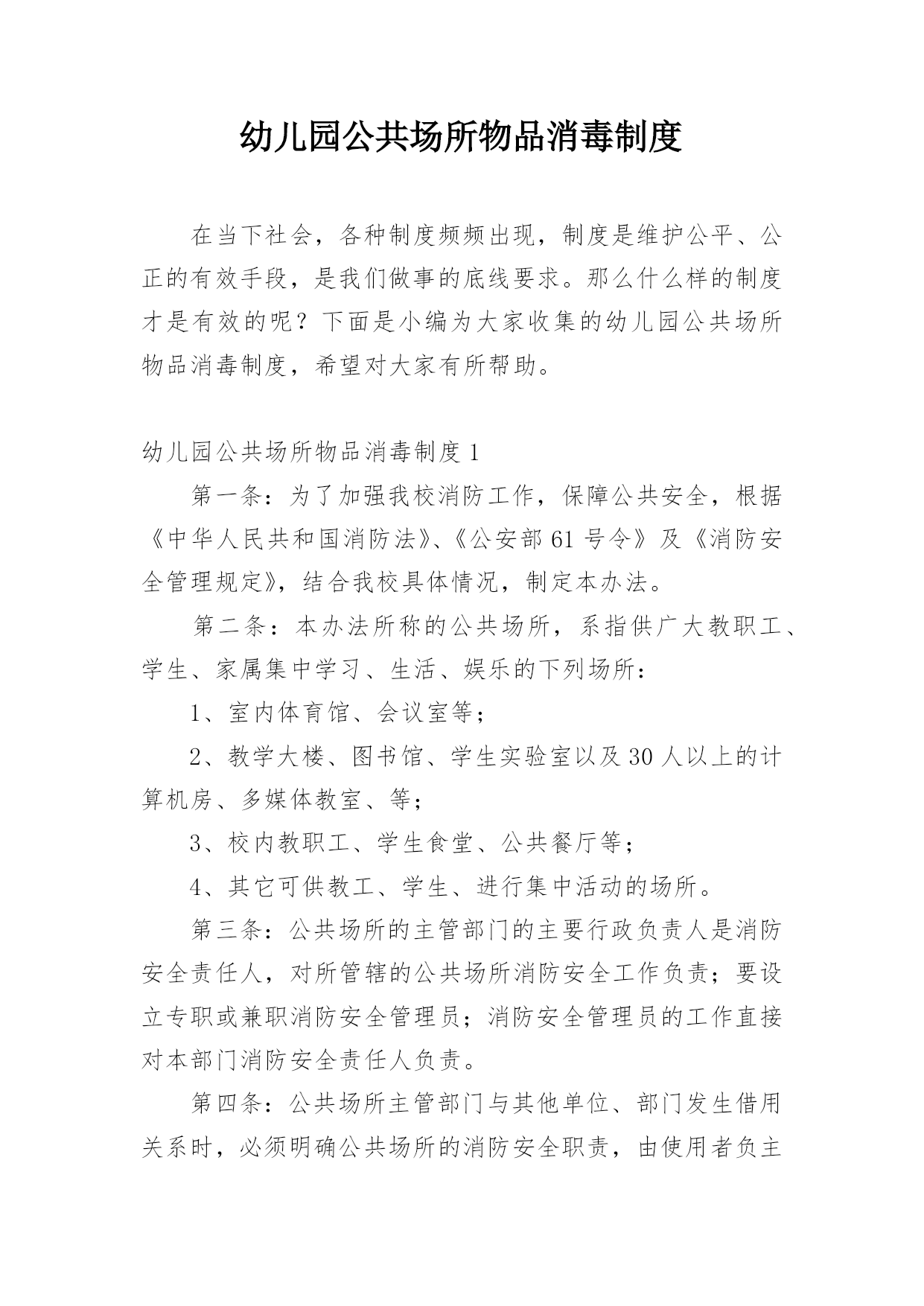 幼儿园公共场所物品消毒制度在当下社会,各种制度频频出现,制度是维护公平、公正的有效手段,是我们做事的底线要求。那么什么样的制度才是有效的呢?下面是小编为大家收集的幼儿园公共场所物品消毒制度,希望对大家有所帮助。幼儿园公共场所物品消毒制度1第一条:为了加强我校消防工作,保障公共安全,根据《中华人民共和国消防法》、《公安部61号令》及《消防安全管理规定》,结合我校具体情况,制定本办法。第二条:本办法所称的公共场所,系指供广大教职工、学生、家属集中学习、生活、娱乐的下列场所:1、室内体育馆、会议室等;2、教学大