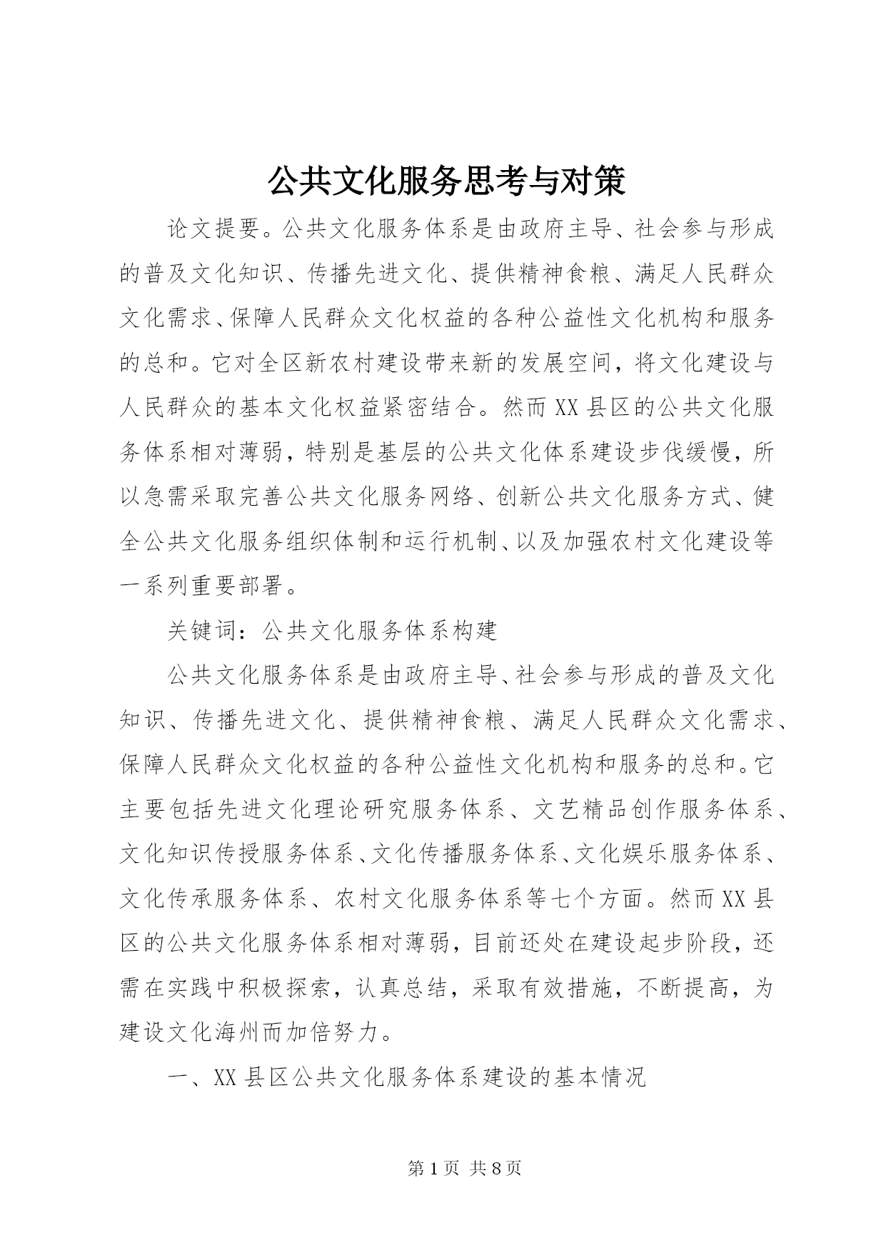 第PAGE\*Arabic\*MERGEFORMAT8页共NUMPAGES\*MERGEFORMAT8页公共文化服务思考与对策论文提要。公共文化服务体系是由政府主导、社会参与形成的普及文化知识、传播先进文化、提供精神食粮、满足人民群众文化需求、保障人民群众文化权益的各种公益性文化机构和服务的总和。它对全区新农村建设带来新的发展空间,将文化建设与人民群众的基本文化权益紧密结合。然而XX县区的公共文化服务体系相对薄弱,特别是基层的公共文化体系建设步伐缓慢,所以急需采取完善公共文化服务网络、创新公共
