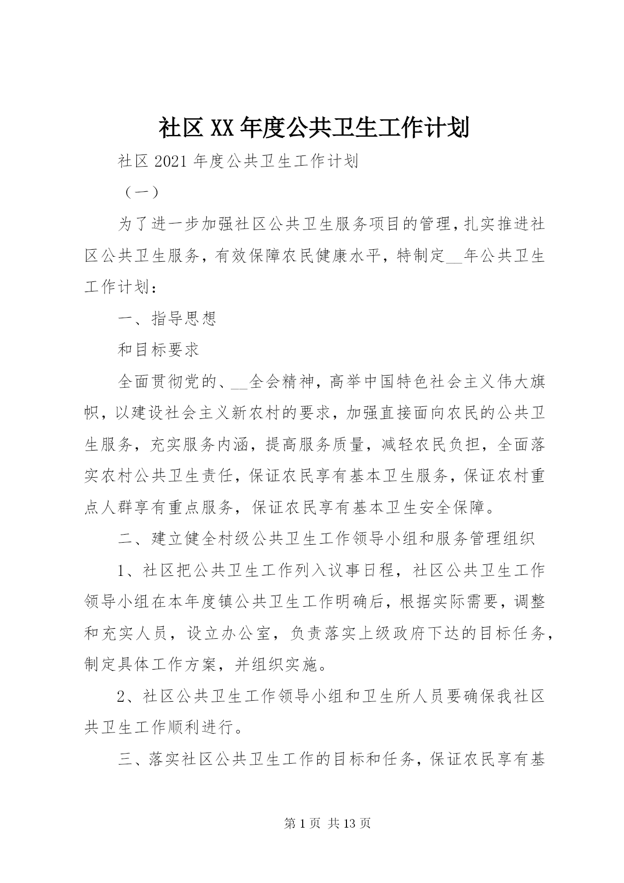 第PAGE\*Arabic\*MERGEFORMAT13页共NUMPAGES\*MERGEFORMAT13页社区XX年度公共卫生工作计划社区2021年度公共卫生工作计划(一)为了进一步加强社区公共卫生服务项目的管理,扎实推进社区公共卫生服务,有效保障农民健康水平,特制定__年公共卫生工作计划:一、指导思想和目标要求全面贯彻党的、__全会精神,高举中国特色社会主义伟大旗帜,以建设社会主义新农村的要求,加强直接面向农民的公共卫生服务,充实服务内涵,提高服务质量,减轻农民负担,全面落实农村公共卫生责
