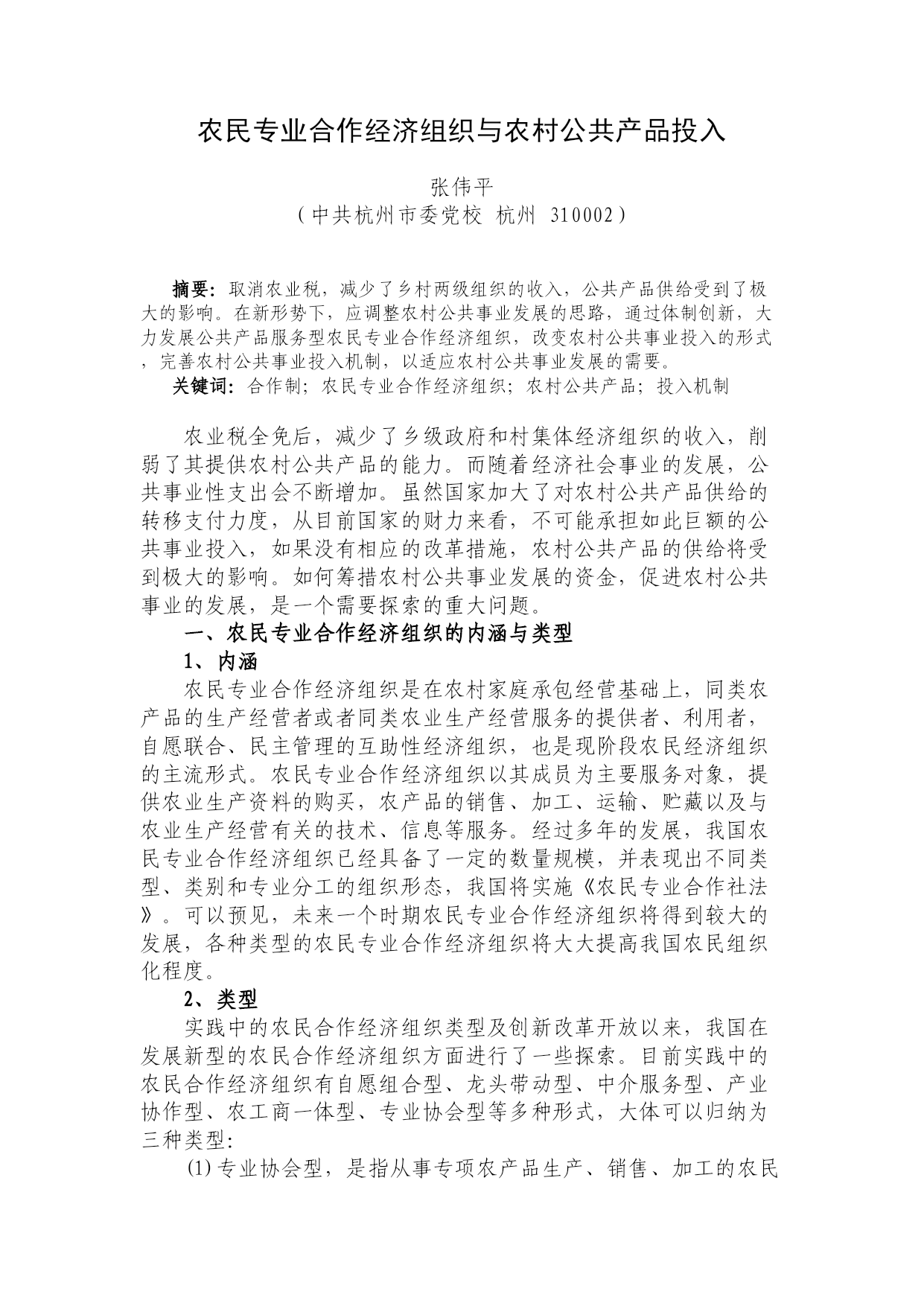 农民专业合作经济组织与农村公共产品投入张伟平(中共杭州市委党校杭州310002)摘要:取消农业税,减少了乡村两级组织的收入,公共产品供给受到了极大的影响。在新形势下,应调整农村公共事业发展的思路,通过体制创新,大力发展公共产品服务型农民专业合作经济组织,改变农村公共事业投入的形式,完善农村公共事业投入机制,以适应农村公共事业发展的需要。关键词:合作制;农民专业合作经济组织;农村公共产品;投入机制农业税全免后,减少了乡级政府和村集体经济组织的收入,削弱了其提供农村公共产品的能力。而随着经济社会事业的发展,公