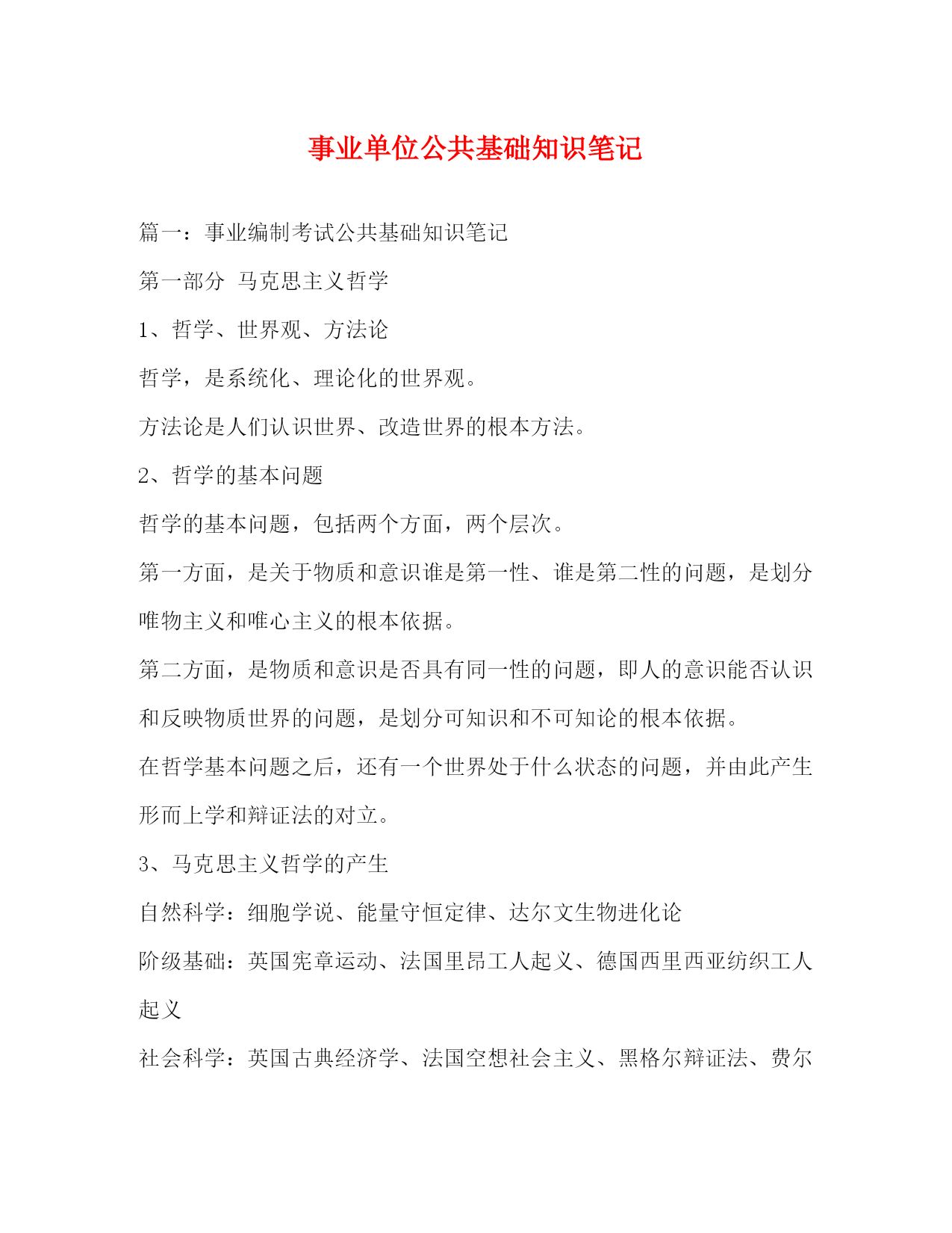 PAGE此资料由网络收集而来,如有侵权请告知上传者立即删除。资料共分享,我们负责传递知识。事业单位公共基础知识笔记篇一:事业编制考试公共基础知识笔记第一部分马克思主义哲学1、哲学、世界观、方法论哲学,是系统化、理论化的世界观。方法论是人们认识世界、改造世界的根本方法。2、哲学的基本问题哲学的基本问题,包括两个方面,两个层次。第一方面,是关于物质和意识谁是第一性、谁是第二性的问题,是划分唯物主义和唯心主义的根本依据。第二方面,是物质和意识是否具有同一性的问题,即人的意识能否认识和反映物质世界的问题,是
