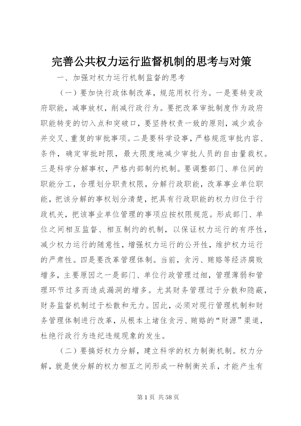 第PAGE\*Arabic\*MERGEFORMAT58页共NUMPAGES\*MERGEFORMAT58页完善公共权力运行监督机制的思考与对策一、加强对权力运行机制监督的思考(一)要加快行政体制改革,规范用权行为。一是要转变政府职能,减事放权,削减行政行为。要把改革审批制度作为政府职能转变的切入点和突破口,要坚持权责一致的原则,减少或合并交叉、重复的审批事项。二是要科学设事,严格规范审批内容、条件,确定审批时限,最大限度地减少审批人员的自由量裁权。三是科学分解事权,严格内部制约机制。要调整部