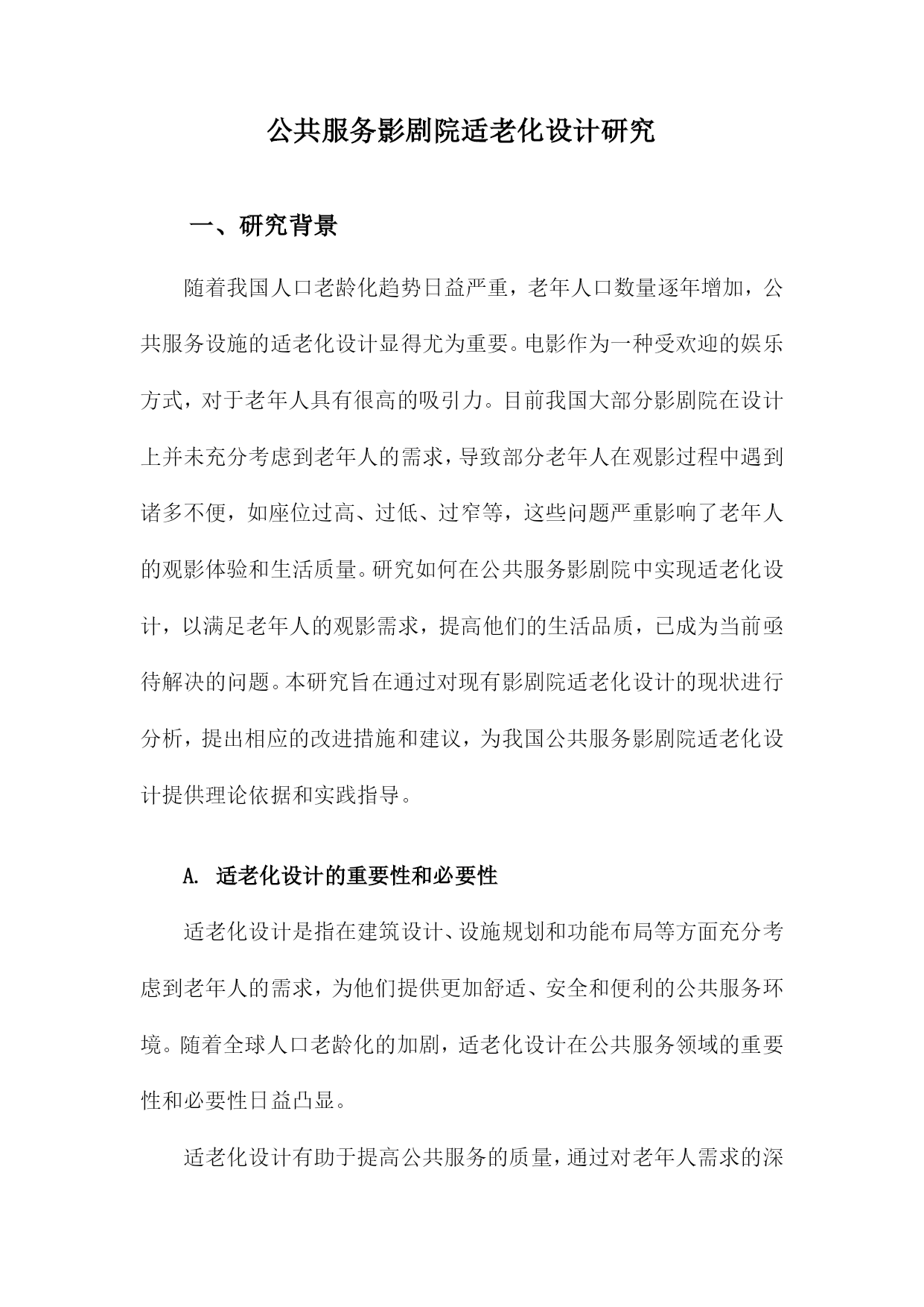 公共服务影剧院适老化设计研究一、研究背景随着我国人口老龄化趋势日益严重,老年人口数量逐年增加,公共服务设施的适老化设计显得尤为重要。电影作为一种受欢迎的娱乐方式,对于老年人具有很高的吸引力。目前我国大部分影剧院在设计上并未充分考虑到老年人的需求,导致部分老年人在观影过程中遇到诸多不便,如座位过高、过低、过窄等,这些问题严重影响了老年人的观影体验和生活质量。研究如何在公共服务影剧院中实现适老化设计,以满足老年人的观影需求,提高他们的生活品质,已成为当前亟待解决的问题。本研究旨在通过对现有影剧院适老化设计的现