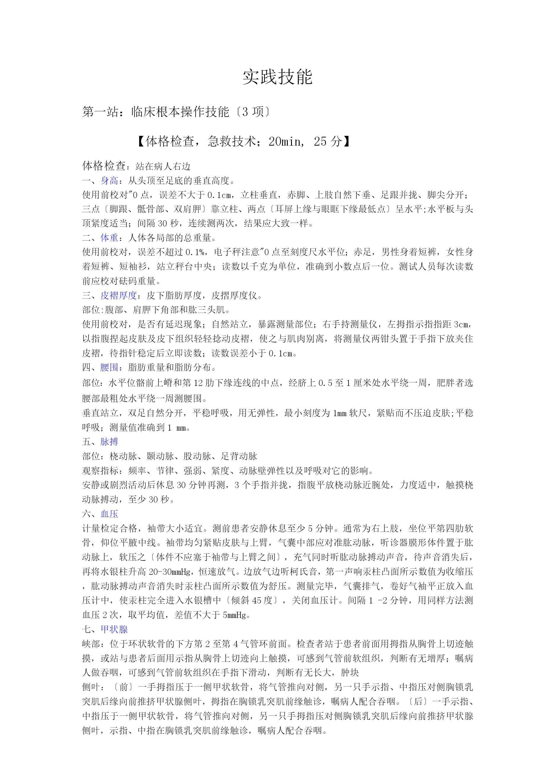实践技能第一站:临床根本操作技能〔3项〕【体格检查,急救技术;20min,25分】体格检查:站在病人右边一、身高:从头顶至足底的垂直高度。使用前校对"0点,误差不大于0.1cm,立柱垂直,赤脚、上肢自然下垂、足跟并拢、脚尖分开;三点〔脚跟、骶骨部、双肩胛〕靠立柱、两点〔耳屏上缘与眼眶下缘最低点〕呈水平;水平板与头顶紧度适当;间隔30秒,连续测两次,结果应大致一样。二、体重:人体各局部的总重量。使用前校对,误差不超过0.1%,电子秤注意"0点至刻度尺水平位;赤足,男性身着短裤,女性身着短裤、短袖衫,站立秤台
