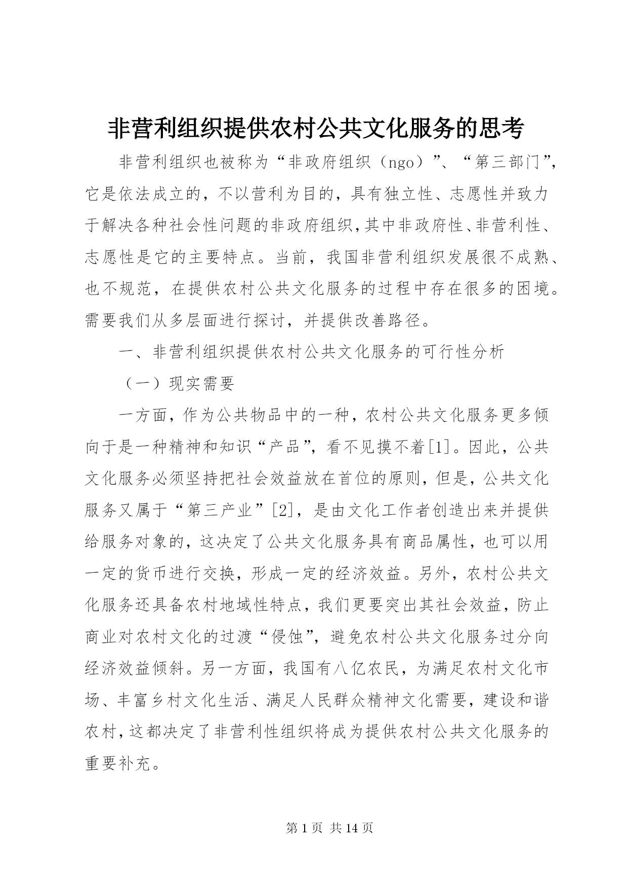 第PAGE\*Arabic\*MERGEFORMAT14页共NUMPAGES\*MERGEFORMAT14页非营利组织提供农村公共文化服务的思考非营利组织也被称为“非政府组织(ngo)”、“第三部门”,它是依法成立的,不以营利为目的,具有独立性、志愿性并致力于解决各种社会性问题的非政府组织,其中非政府性、非营利性、志愿性是它的主要特点。当前,我国非营利组织发展很不成熟、也不规范,在提供农村公共文化服务的过程中存在很多的困境。需要我们从多层面进行探讨,并提供改善路径。一、非营利组织提供农村公共文