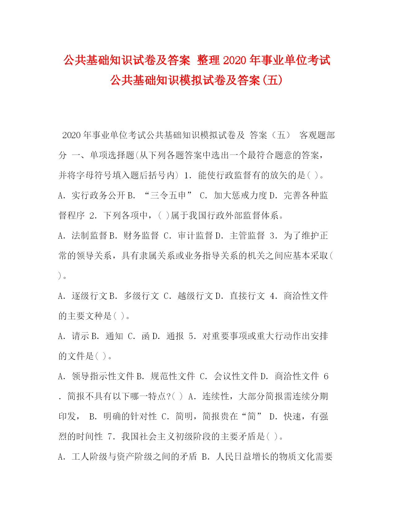 PAGE此资料由网络收集而来,如有侵权请告知上传者立即删除。资料共分享,我们负责传递知识。公共基础知识试卷及答案整理2020年事业单位考试公共基础知识模拟试卷及答案(五)2020年事业单位考试公共基础知识模拟试卷及答案(五)客观题部分一、单项选择题(从下列各题答案中选出一个最符合题意的答案,并将字母符号填入题后括号内)1.能使行政监督有的放矢的是()。A.实行政务公开B.“三令五申”C.加大惩戒力度D.完善各种监督程序2.下列各项中,()属于我国行政外部监督体系。A.法制监督B.财务监督C.审计监督