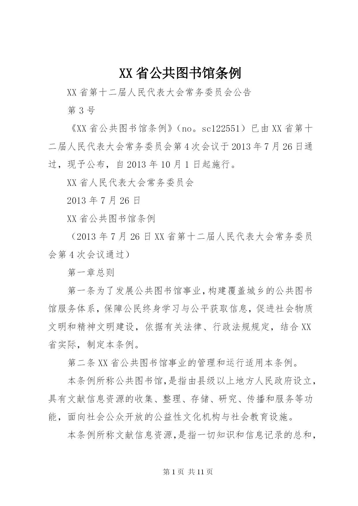 第PAGE\*Arabic\*MERGEFORMAT11页共NUMPAGES\*MERGEFORMAT11页XX省公共图书馆条例XX省第十二届人民代表大会常务委员会公告第3号《XX省公共图书馆条例》(no。sc122551)已由XX省第十二届人民代表大会常务委员会第4次会议于2013年7月26日通过,现予公布,自2013年10月1日起施行。XX省人民代表大会常务委员会2013年7月26日XX省公共图书馆条例(2013年7月26日XX省第十二届人民代表大会常务委员会第4次会议通过)第一章总则第一