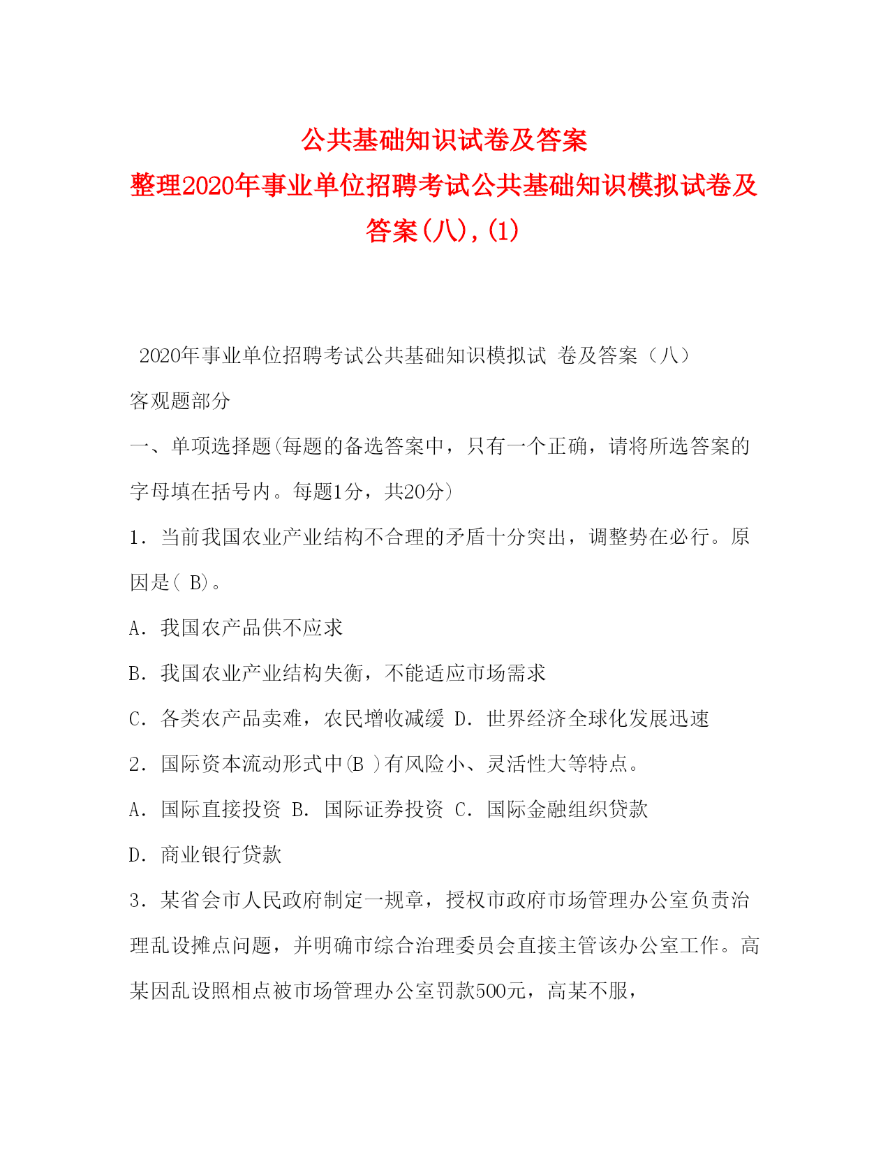 PAGE此资料由网络收集而来,如有侵权请告知上传者立即删除。资料共分享,我们负责传递知识。公共基础知识试卷及答案整理2020年事业单位招聘考试公共基础知识模拟试卷及答案(八),(1)2020年事业单位招聘考试公共基础知识模拟试卷及答案(八)客观题部分一、单项选择题(每题的备选答案中,只有一个正确,请将所选答案的字母填在括号内。每题1分,共20分)1.当前我国农业产业结构不合理的矛盾十分突出,调整势在必行。原因是(B)。A.我国农产品供不应求B.我国农业产业结构失衡,不能适应市场需求C.各类农产品卖难