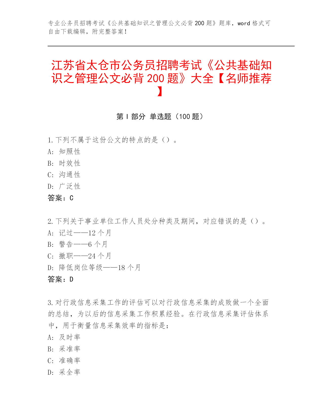 专业公务员招聘考试《公共基础知识之管理公文必背200题》题库,word格式可自由下载编辑,附完整答案!江苏省太仓市公务员招聘考试《公共基础知识之管理公文必背200题》大全【名师推荐】第I部分单选题(100题)1.下列不属于这份公文的特点的是()。A:知照性B:时效性C:沟通性D:广泛性答案:C2.下列关于事业单位工作人员处分种类及期间,对应错误的是()。A:记过——12个月B:警告——6个月C:撤职——24个月D:降低岗位等级——18个月答案:D3.对行政信息采集工作的评估可以对行政信息采集的成败做一个全