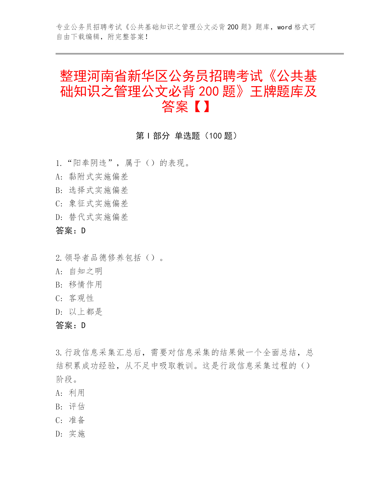 专业公务员招聘考试《公共基础知识之管理公文必背200题》题库,word格式可自由下载编辑,附完整答案!整理河南省新华区公务员招聘考试《公共基础知识之管理公文必背200题》王牌题库及答案【】第I部分单选题(100题)1.“阳奉阴违”,属于()的表现。A:黏附式实施偏差B:选择式实施偏差C:象征式实施偏差D:替代式实施偏差答案:D2.领导者品德修养包括()。A:自知之明B:移情作用C:客观性D:以上都是答案:D3.行政信息采集汇总后,需要对信息采集的结果做一个全面总结,总结积累成功经验,从不足中吸取教训。这是
