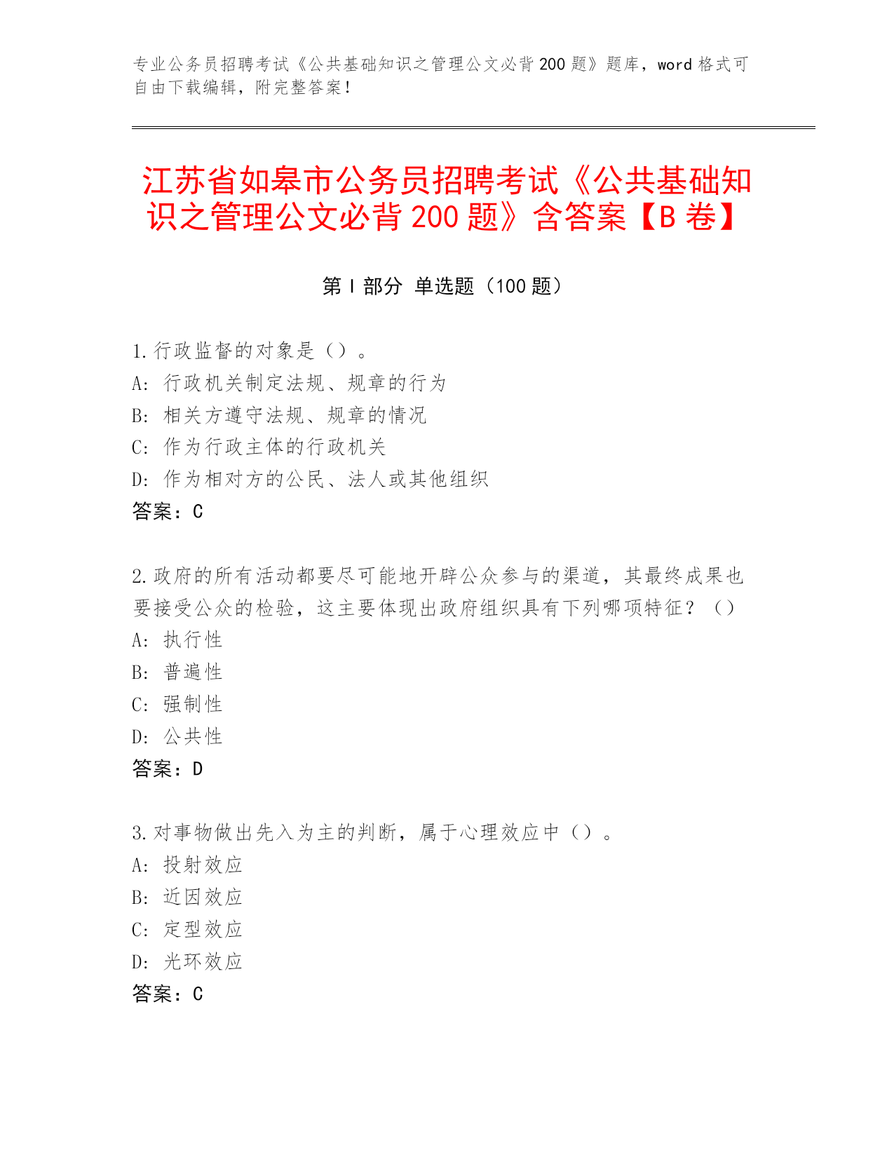 专业公务员招聘考试《公共基础知识之管理公文必背200题》题库,word格式可自由下载编辑,附完整答案!江苏省如皋市公务员招聘考试《公共基础知识之管理公文必背200题》含答案【B卷】第I部分单选题(100题)1.行政监督的对象是()。A:行政机关制定法规、规章的行为B:相关方遵守法规、规章的情况C:作为行政主体的行政机关D:作为相对方的公民、法人或其他组织答案:C2.政府的所有活动都要尽可能地开辟公众参与的渠道,其最终成果也要接受公众的检验,这主要体现出政府组织具有下列哪项特征?()A:执行性B:普遍性C: