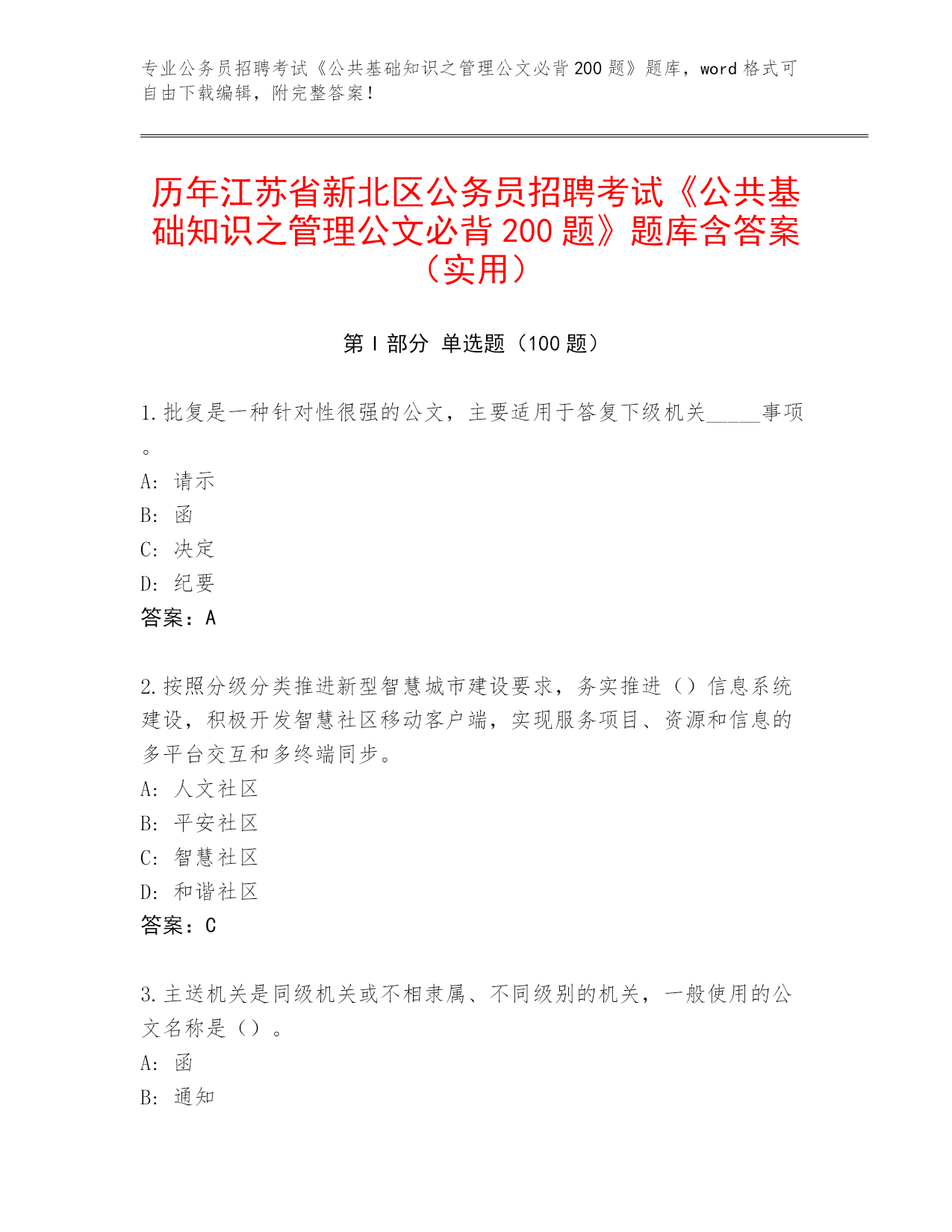 历年江苏省新北区公务员招聘考试《公共基础知识之管理公文必背200题》题库含答案(实用).docx