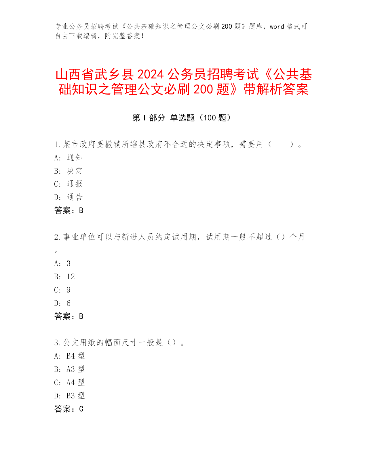 山西省武乡县2024公务员招聘考试《公共基础知识之管理公文必刷200题》带解析答案.docx