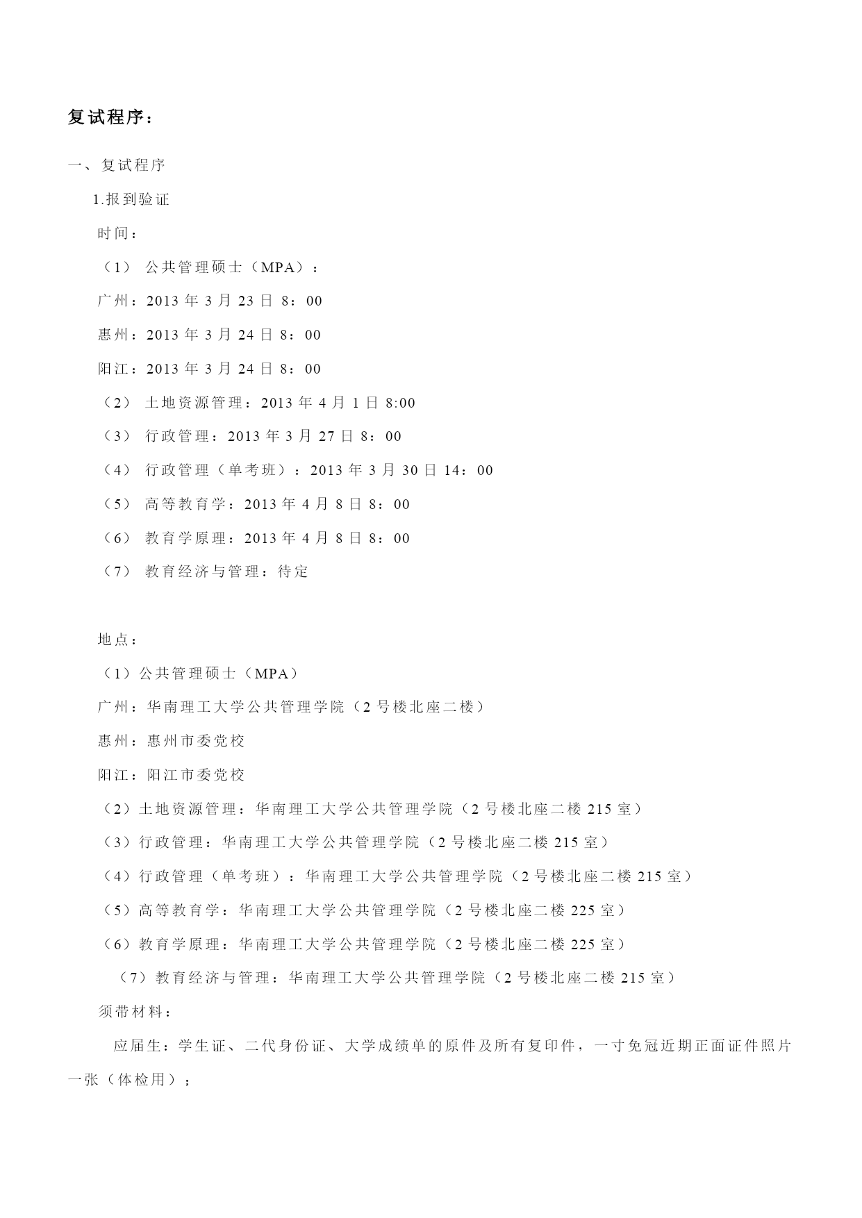 复试程序:一、复试程序1.报到验证时间:(1)公共管理硕士(MPA):广州:2013年3月23日8:00惠州:2013年3月24日8:00阳江:2013年3月24日8:00(2)土地资源管理:2013年4月1日8:00(3)行政管理:2013年3月27日8:00(4)行政管理(单考班):2013年3月30日14:00(5)高等教育学:2013年4月8日8:00(6)教育学原理:2013年4月8日8:00(7)教育经济与管理:待定地点:(1)公共管理硕士(MPA)广州:华南理工大学公共管理学院(2号楼北座二
