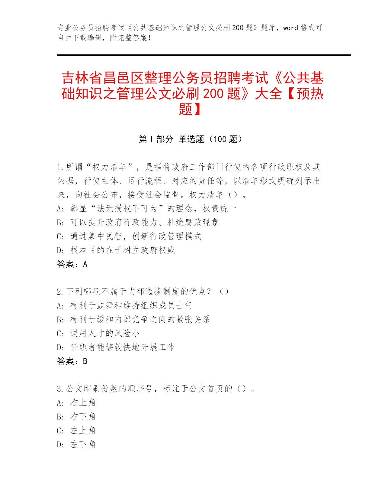 专业公务员招聘考试《公共基础知识之管理公文必刷200题》题库,word格式可自由下载编辑,附完整答案!内部使用福建省公务员招聘考试《公共基础知识之管理公文必刷200题》完整版含答案第I部分单选题(100题)1.我国社区建设是各类社区主体、各种社区力量共同参与的城市管理新模式。这体现了社区建设的()特点。A:综合性B:计划性C:社会性D:地域性答案:C2.当主送机关名称过多导致公文首页不能显示正文时,恰当的处理办法是()。A:将主送机关名称移至版记B:全部省略(即不标注主送机关名称)C:在第一个主送机关称后