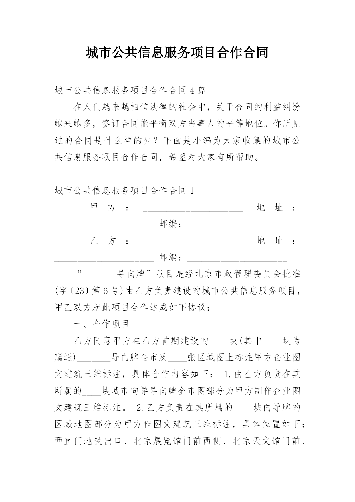 城市公共信息服务项目合作合同城市公共信息服务项目合作合同4篇在人们越来越相信法律的社会中,关于合同的利益纠纷越来越多,签订合同能平衡双方当事人的平等地位。你所见过的合同是什么样的呢?下面是小编为大家收集的城市公共信息服务项目合作合同,希望对大家有所帮助。城市公共信息服务项目合作合同1甲方:_____________________地址:_____________________邮编:_____________________乙方:_____________________地址:______________