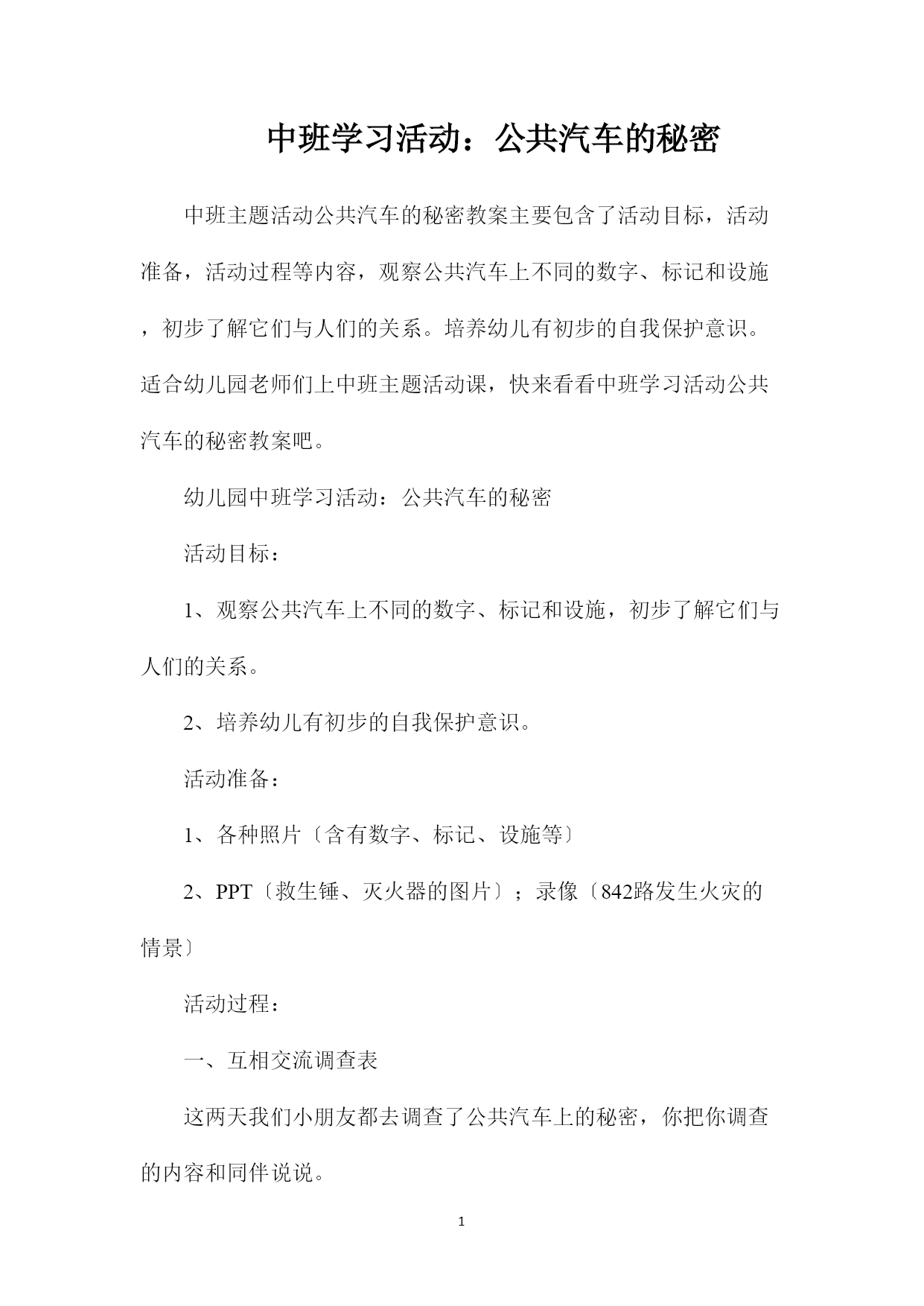 PAGEPAGE3中班学习活动:公共汽车的秘密中班主题活动公共汽车的秘密教案主要包含了活动目标,活动准备,活动过程等内容,观察公共汽车上不同的数字、标记和设施,初步了解它们与人们的关系。培养幼儿有初步的自我保护意识。适合幼儿园老师们上中班主题活动课,快来看看中班学习活动公共汽车的秘密教案吧。幼儿园中班学习活动:公共汽车的秘密活动目标:1、观察公共汽车上不同的数字、标记和设施,初步了解它们与人们的关系。2、培养幼儿有初步的自我保护意识。活动准备:1、各种照片〔含有数字、标记、设施等〕2、PPT〔