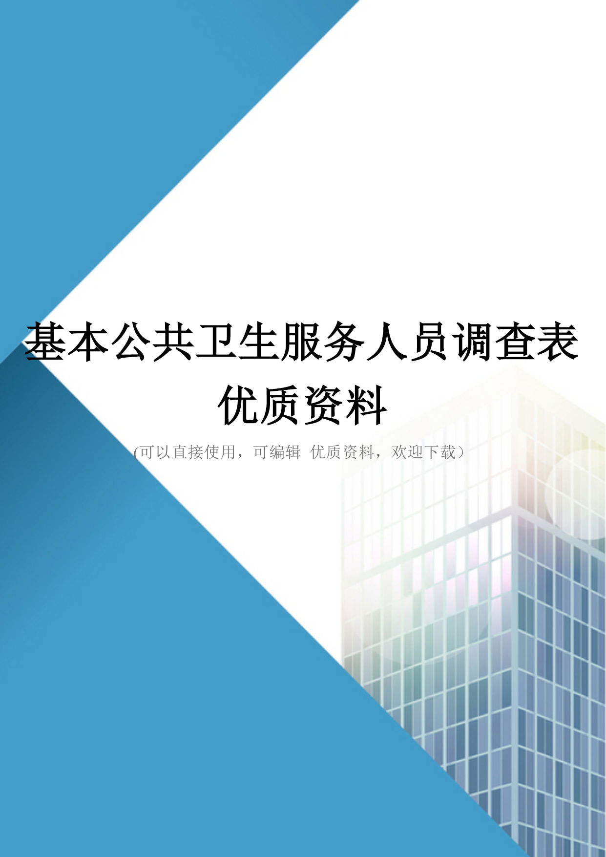 基本公共卫生服务人员调查表优质资料(可以直接使用,可编辑优质资料,欢迎下载)附件6基本公共卫生服务人员调查表尊敬的基本公共卫生服务人员:本次调查是为江苏省基本公共卫生服务的人力资源配置提供数据资料。调查的宗旨是通过调查、分析和研究,按照基本公共卫生服务的标准化操作流程,测算基本公共卫生服务每一项目的标准工时,对合理配置乡镇卫生院公共卫生人力具有一定的参考和研究价值,以改进卫生服务机构的服务质量,更好的为促进社区居民健康服务。本次调查对象是提供基本公共卫生服务全体人员(包括专职和兼职)。所有人需要填写第1-