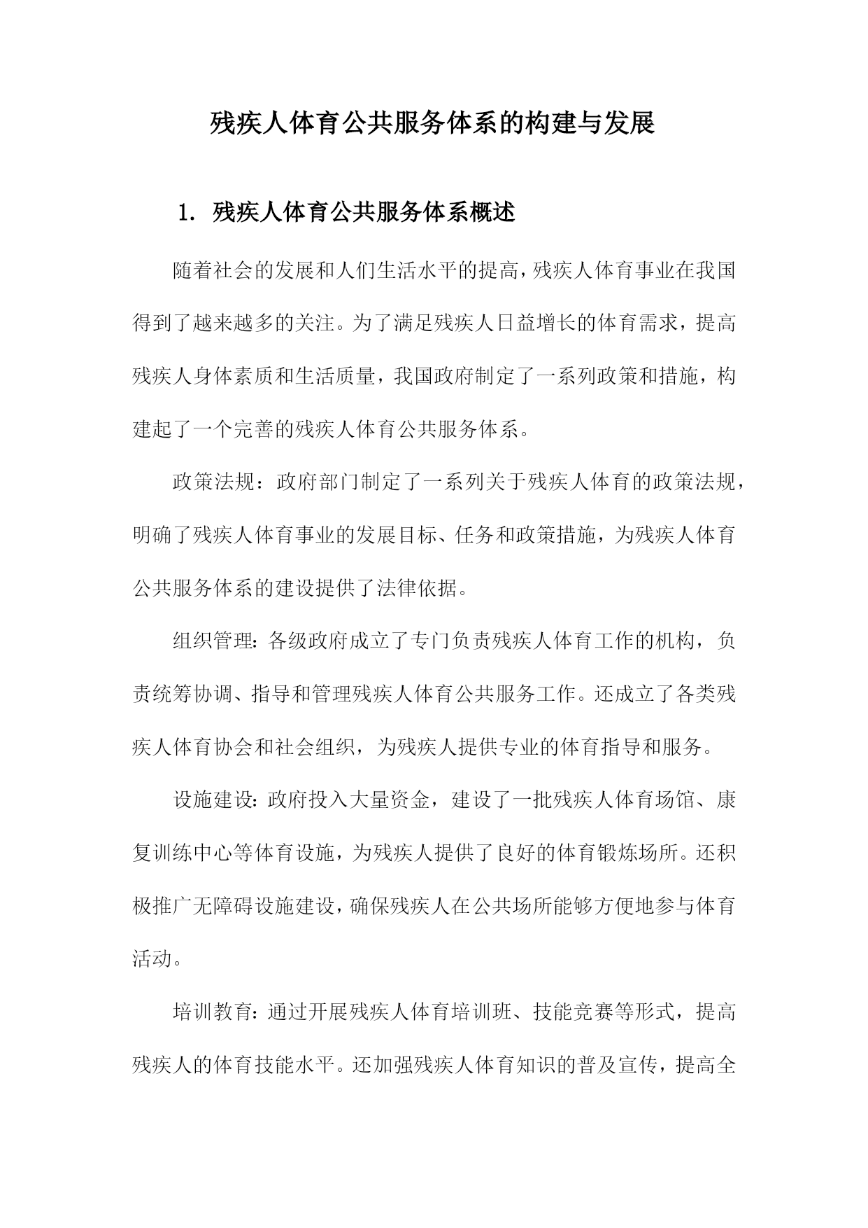 残疾人体育公共服务体系的构建与发展1.残疾人体育公共服务体系概述随着社会的发展和人们生活水平的提高,残疾人体育事业在我国得到了越来越多的关注。为了满足残疾人日益增长的体育需求,提高残疾人身体素质和生活质量,我国政府制定了一系列政策和措施,构建起了一个完善的残疾人体育公共服务体系。政策法规:政府部门制定了一系列关于残疾人体育的政策法规,明确了残疾人体育事业的发展目标、任务和政策措施,为残疾人体育公共服务体系的建设提供了法律依据。组织管理:各级政府成立了专门负责残疾人体育工作的机构,负责统筹协调、指导和管理残