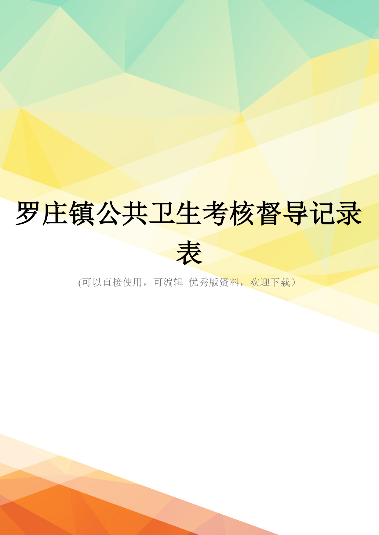 罗庄镇公共卫生考核督导记录表(可以直接使用,可编辑优秀版资料,欢迎下载)公卫表1居民健康档案督导记录表邓州市罗庄镇卫生院20年月日项目督导内容分值得分备注档案管理是否有专职(兼)人负责,是否有制定村卫生室居民健康档案督导方案,缺1项扣2分。5专柜设置,否扣1分。档案保管达到防火、防虫、防鼠要求,达不到要求扣1分。数量是否够用,不够用扣0.5分。5存放管理:档案标示是否清晰明朗,否扣0。5分。存放是否便于取阅,不便扣0.5分。5建档质量随机抽取5份健康档案(重点人群除外),入户或询问率应达到50%。随即抽取