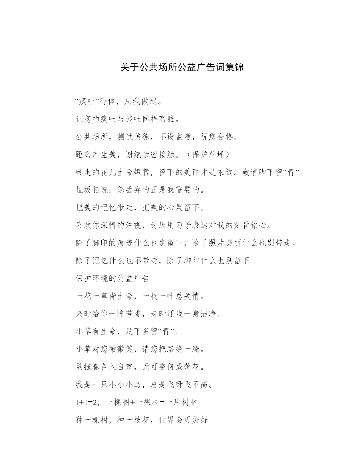 关于公共场所公益广告词集锦“痰吐”得体,从我做起。让您的痰吐与谈吐同样高雅。公共场所,测试美德,不设监考,祝您合格。距离产生美,谢绝亲密接触。(保护草坪)带走的花儿生命短暂,留下的美丽才是永远。敬请脚下留“青”。垃圾箱说:您丢弃的正是我需要的。把美的记忆带走,把美的心灵留下。喜欢你深情的注视,讨厌用刀子表达对我的刻骨铭心。除了脚印的痕迹什么也别留下,除了照片美丽什么也别带走。除了记忆什么也不带走,除了脚印什么也别留下保护环境的公益广告一花一草皆生命,一枝一叶总关情。来时给你一阵芳香,走时还我一身洁净。小草