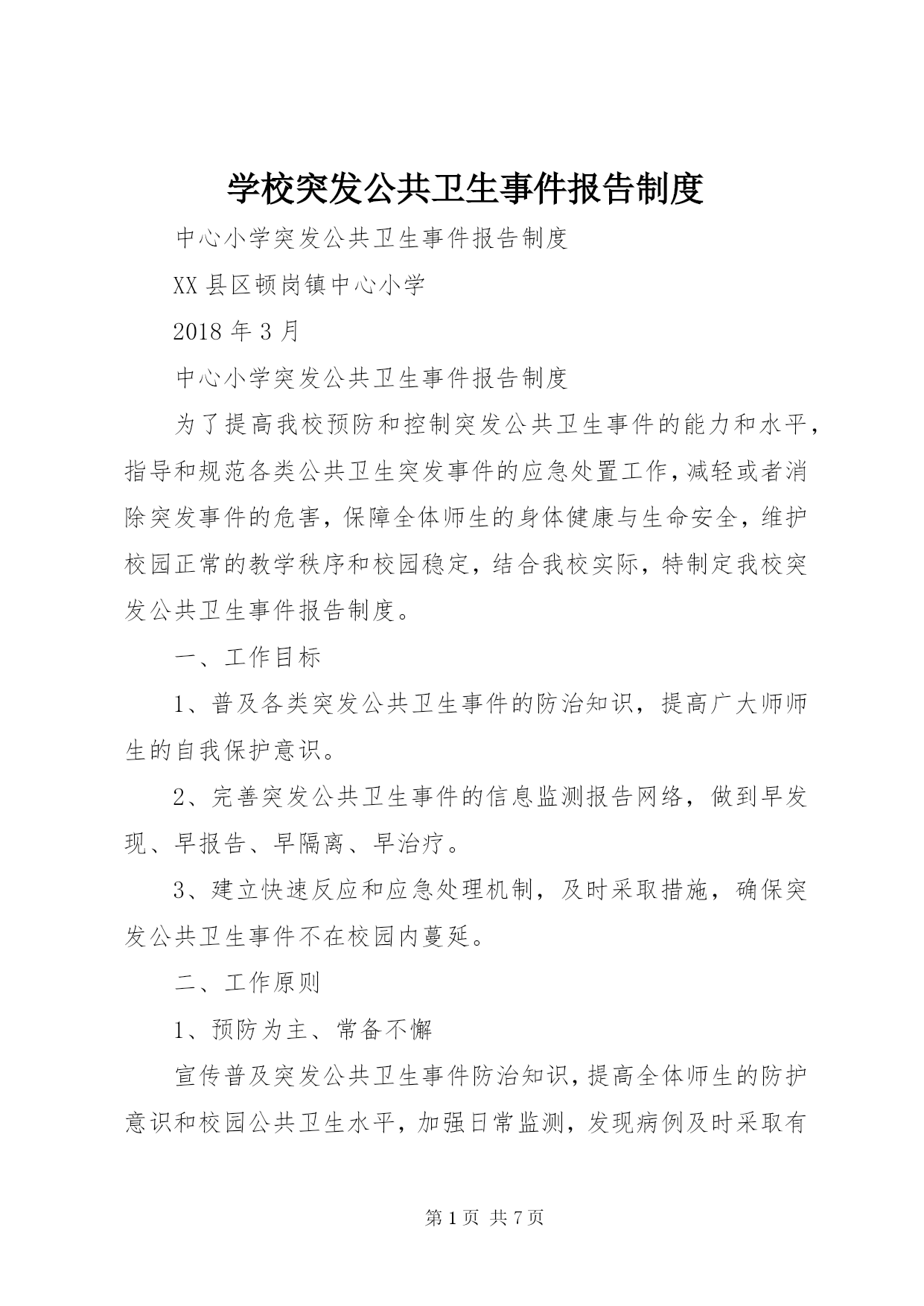 第PAGE\*Arabic\*MERGEFORMAT7页共NUMPAGES\*MERGEFORMAT7页学校突发公共卫生事件报告制度中心小学突发公共卫生事件报告制度XX县区顿岗镇中心小学2018年3月中心小学突发公共卫生事件报告制度为了提高我校预防和控制突发公共卫生事件的能力和水平,指导和规范各类公共卫生突发事件的应急处置工作,减轻或者消除突发事件的危害,保障全体师生的身体健康与生命安全,维护校园正常的教学秩序和校园稳定,结合我校实际,特制定我校突发公共卫生事件报告制度。一、工作目标1、普及各