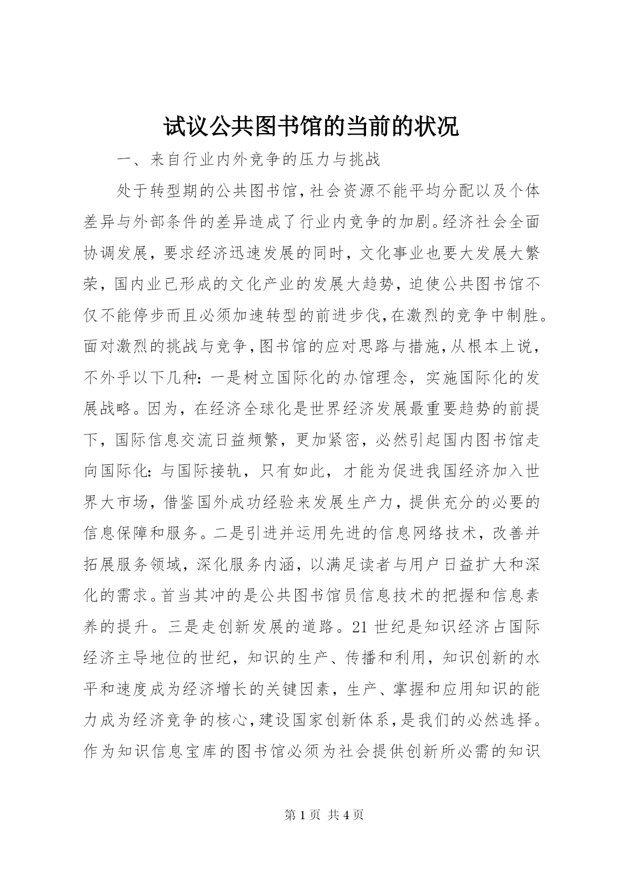 第PAGE\*Arabic\*MERGEFORMAT4页共NUMPAGES\*MERGEFORMAT4页试议公共图书馆的当前的状况一、来自行业内外竞争的压力与挑战处于转型期的公共图书馆,社会资源不能平均分配以及个体差异与外部条件的差异造成了行业内竞争的加剧。经济社会全面协调发展,要求经济迅速发展的同时,文化事业也要大发展大繁荣,国内业已形成的文化产业的发展大趋势,迫使公共图书馆不仅不能停步而且必须加速转型的前进步伐,在激烈的竞争中制胜。面对激烈的挑战与竞争,图书馆的应对思路与措施,从根本上说,