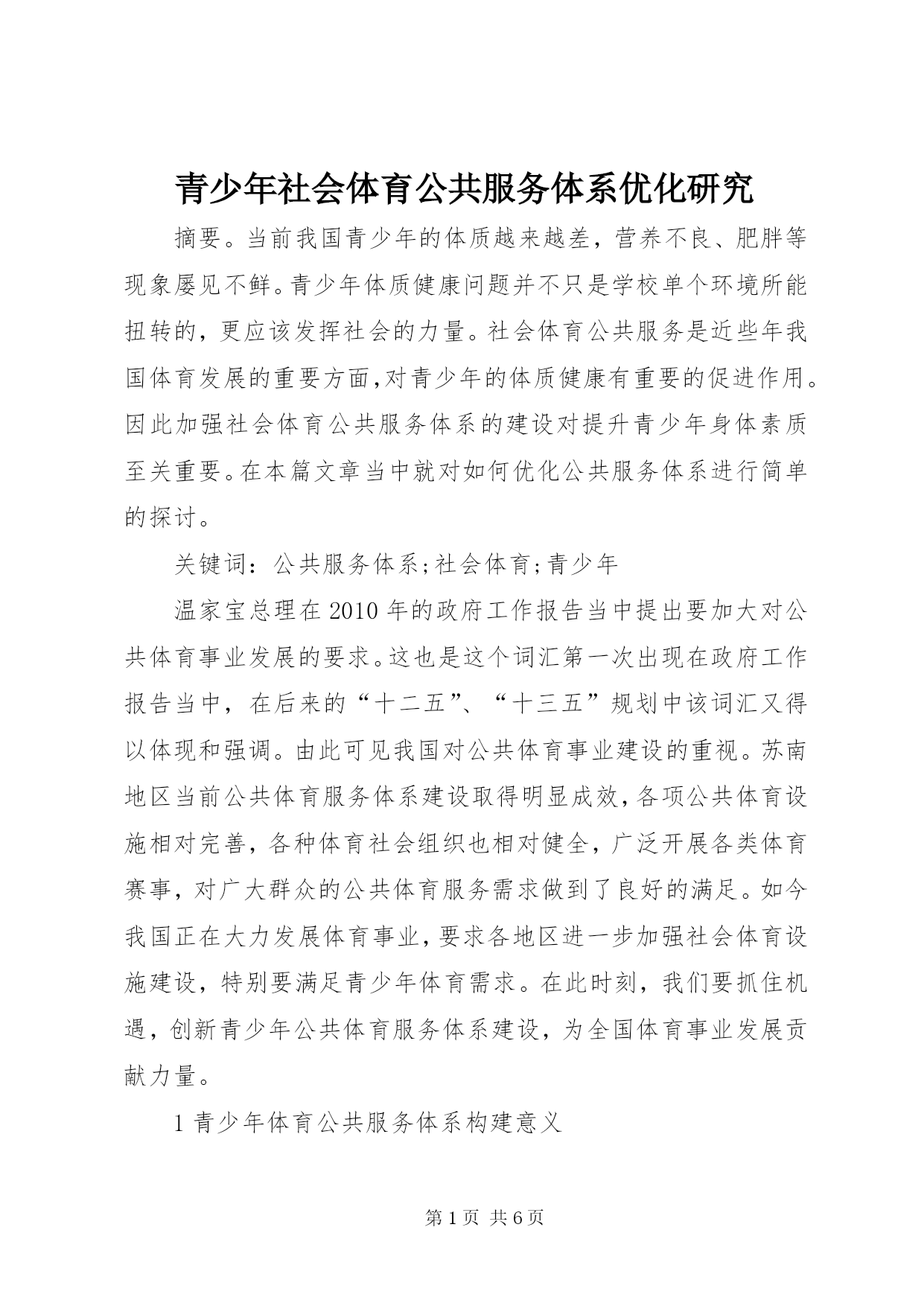 第PAGE\*Arabic\*MERGEFORMAT6页共NUMPAGES\*MERGEFORMAT6页青少年社会体育公共服务体系优化研究摘要。当前我国青少年的体质越来越差,营养不良、肥胖等现象屡见不鲜。青少年体质健康问题并不只是学校单个环境所能扭转的,更应该发挥社会的力量。社会体育公共服务是近些年我国体育发展的重要方面,对青少年的体质健康有重要的促进作用。因此加强社会体育公共服务体系的建设对提升青少年身体素质至关重要。在本篇文章当中就对如何优化公共服务体系进行简单的探讨。关键词:公共服务体系