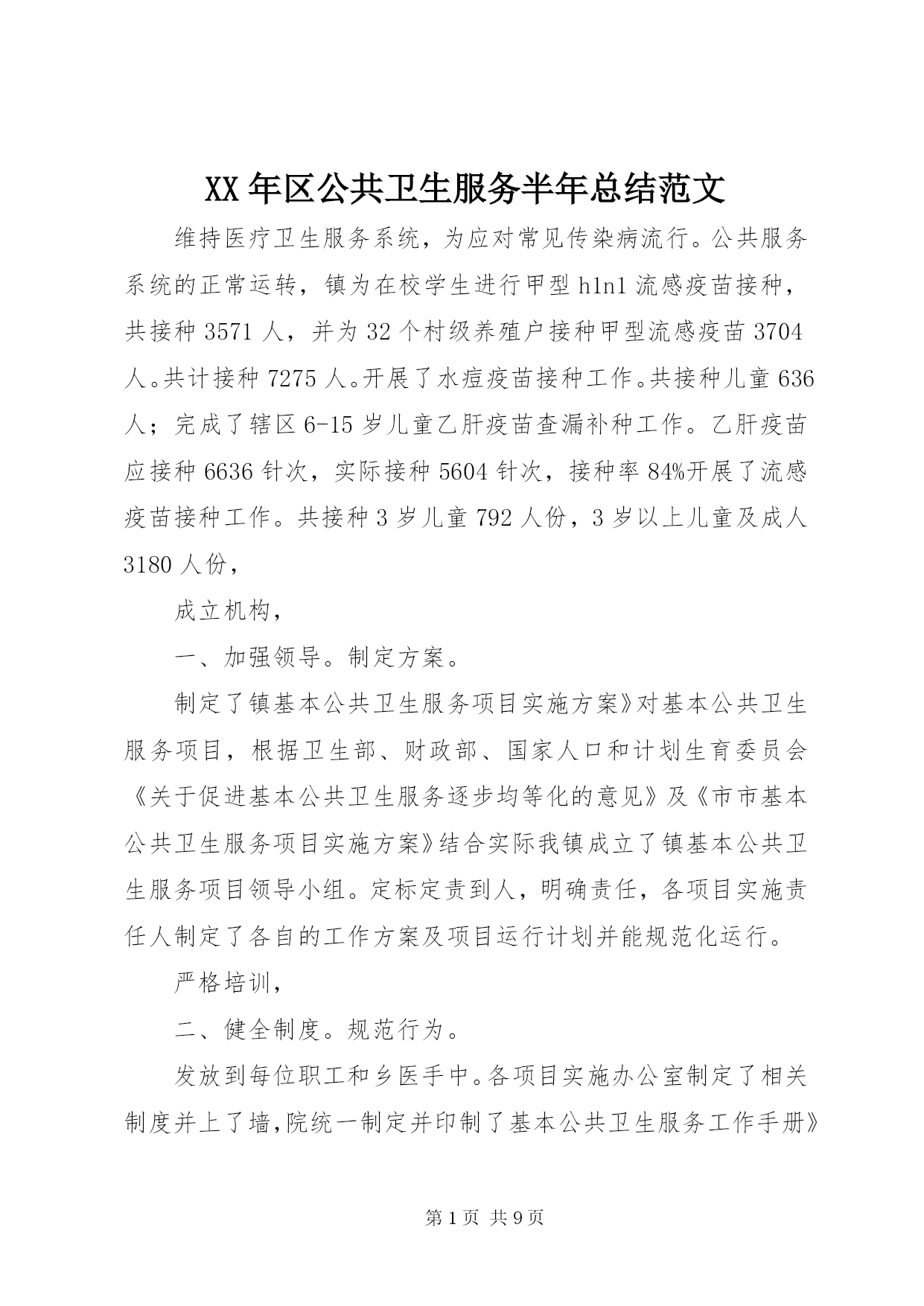 第PAGE\*Arabic\*MERGEFORMAT9页共NUMPAGES\*MERGEFORMAT9页XX年区公共卫生服务半年总结范文维持医疗卫生服务系统,为应对常见传染病流行。公共服务系统的正常运转,镇为在校学生进行甲型h1n1流感疫苗接种,共接种3571人,并为32个村级养殖户接种甲型流感疫苗3704人。共计接种7275人。开展了水痘疫苗接种工作。共接种儿童636人;完成了辖区6-15岁儿童乙肝疫苗查漏补种工作。乙肝疫苗应接种6636针次,实际接种5604针次,接种率84%开展了流感疫苗