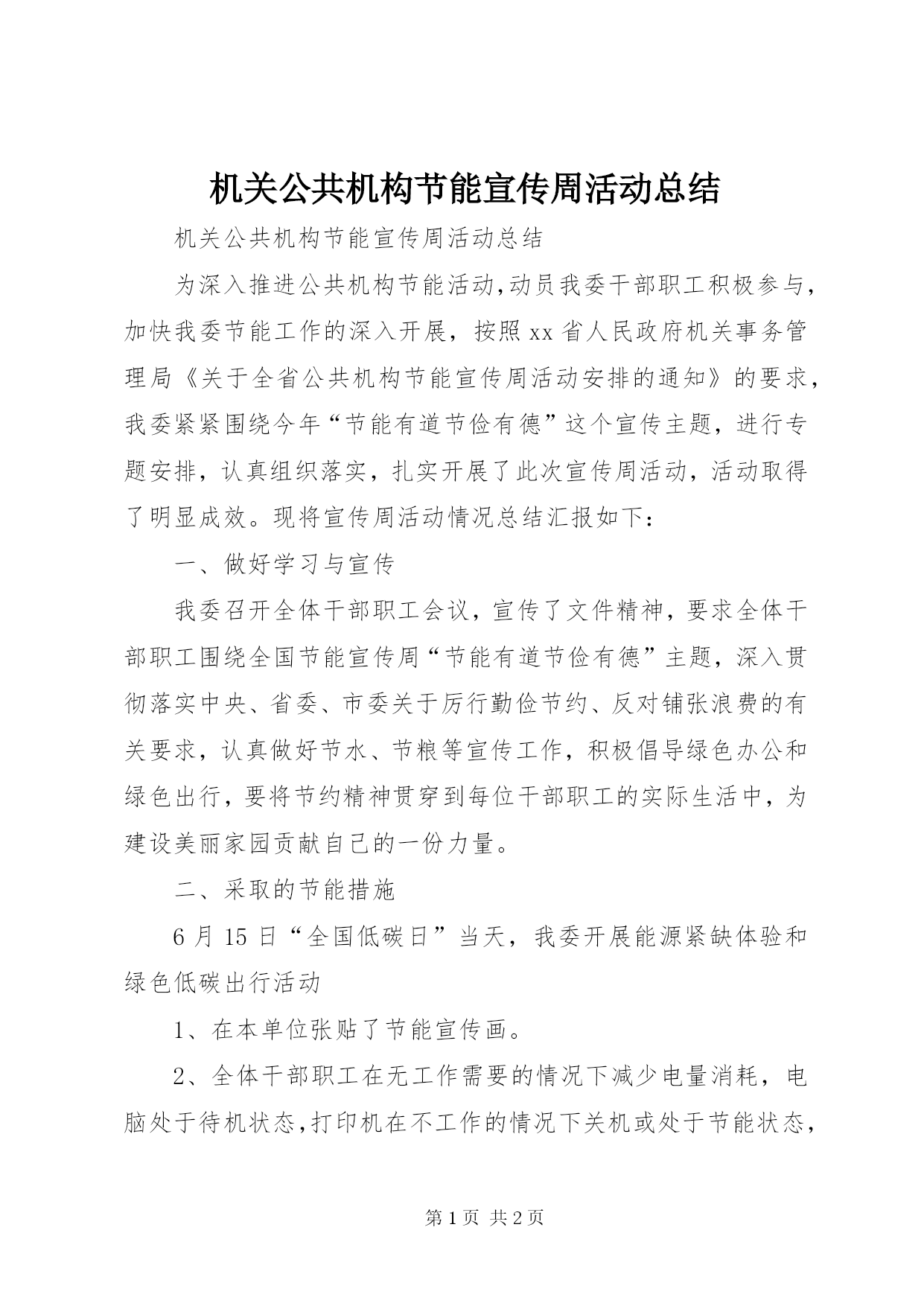 第PAGE\*Arabic\*MERGEFORMAT2页共NUMPAGES\*MERGEFORMAT2页机关公共机构节能宣传周活动总结机关公共机构节能宣传周活动总结为深入推进公共机构节能活动,动员我委干部职工积极参与,加快我委节能工作的深入开展,按照xx省人民政府机关事务管理局《关于全省公共机构节能宣传周活动安排的通知》的要求,我委紧紧围绕今年“节能有道节俭有德”这个宣传主题,进行专题安排,认真组织落实,扎实开展了此次宣传周活动,活动取得了明显成效。现将宣传周活动情况总结汇报如下:一、做好学习