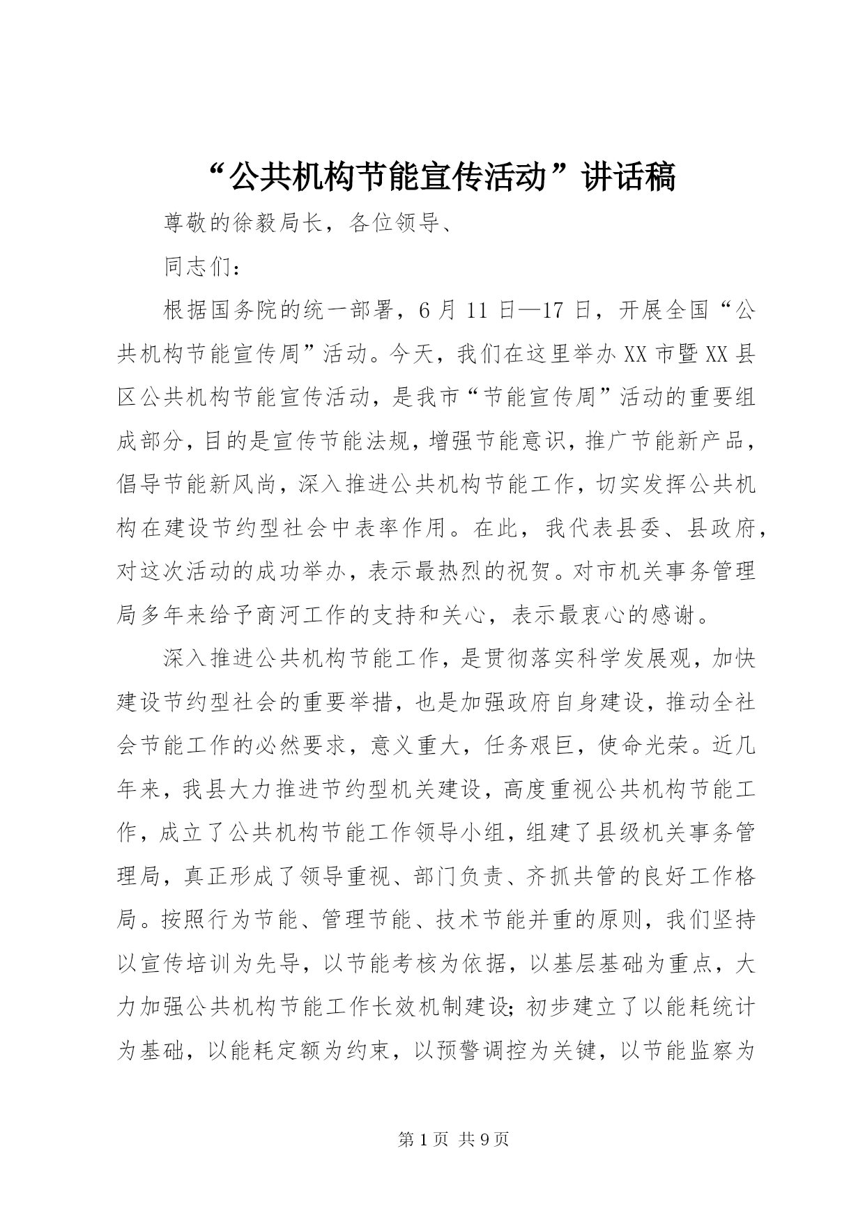 第PAGE\*Arabic\*MERGEFORMAT9页共NUMPAGES\*MERGEFORMAT9页“公共机构节能宣传活动”讲话稿尊敬的徐毅局长,各位领导、同志们:根据国务院的统一部署,6月11日—17日,开展全国“公共机构节能宣传周”活动。今天,我们在这里举办XX市暨XX县区公共机构节能宣传活动,是我市“节能宣传周”活动的重要组成部分,目的是宣传节能法规,增强节能意识,推广节能新产品,倡导节能新风尚,深入推进公共机构节能工作,切实发挥公共机构在建设节约型社会中表率作用。在此,我代表县委、