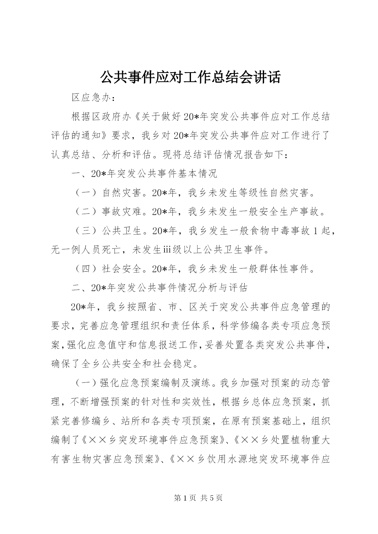 第PAGE\*Arabic\*MERGEFORMAT5页共NUMPAGES\*MERGEFORMAT5页公共事件应对工作总结会讲话区应急办:根据区政府办《关于做好20*年突发公共事件应对工作总结评估的通知》要求,我乡对20*年突发公共事件应对工作进行了认真总结、分析和评估。现将总结评估情况报告如下:一、20*年突发公共事件基本情况(一)自然灾害。20*年,我乡未发生等级性自然灾害。(二)事故灾难。20*年,我乡未发生一般安全生产事故。(三)公共卫生。20*年,我乡发生一般食物中毒事故1起,无一