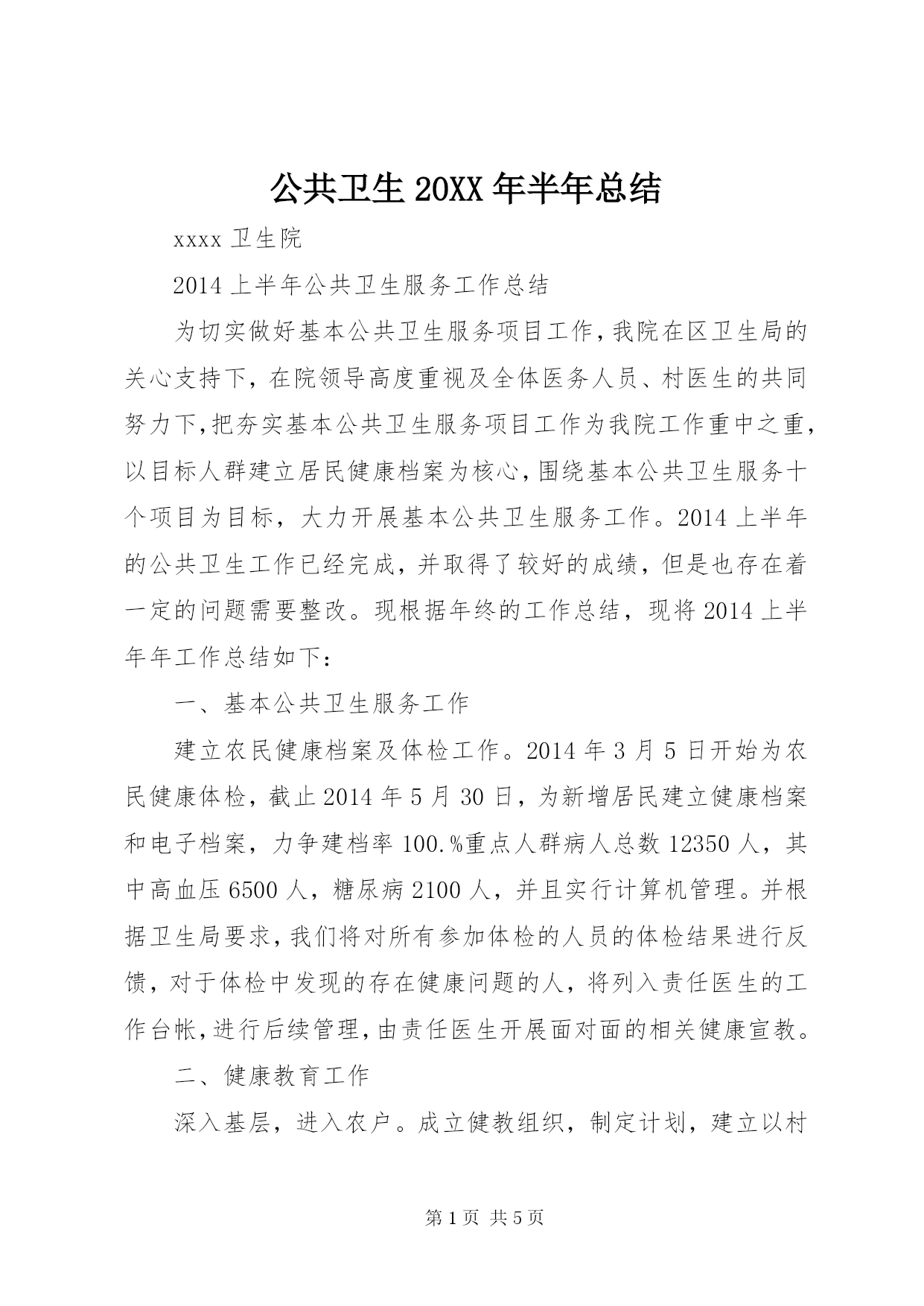 第PAGE\*Arabic\*MERGEFORMAT5页共NUMPAGES\*MERGEFORMAT5页公共卫生20XX年半年总结xxxx卫生院2014上半年公共卫生服务工作总结为切实做好基本公共卫生服务项目工作,我院在区卫生局的关心支持下,在院领导高度重视及全体医务人员、村医生的共同努力下,把夯实基本公共卫生服务项目工作为我院工作重中之重,以目标人群建立居民健康档案为核心,围绕基本公共卫生服务十个项目为目标,大力开展基本公共卫生服务工作。2014上半年的公共卫生工作已经完成,并取得了较好的成