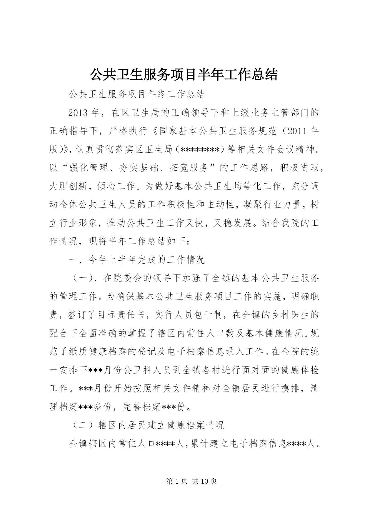 第PAGE\*Arabic\*MERGEFORMAT10页共NUMPAGES\*MERGEFORMAT10页公共卫生服务项目半年工作总结公共卫生服务项目年终工作总结2013年,在区卫生局的正确领导下和上级业务主管部门的正确指导下,严格执行《国家基本公共卫生服务规范(2011年版)》,认真贯彻落实区卫生局(********)等相关文件会议精神。以“强化管理、夯实基础、拓宽服务”的工作思路,积极进取,大胆创新,倾心工作。为做好基本公共卫生均等化工作,充分调动全体公共卫生人员的工作积极性和主动性,凝