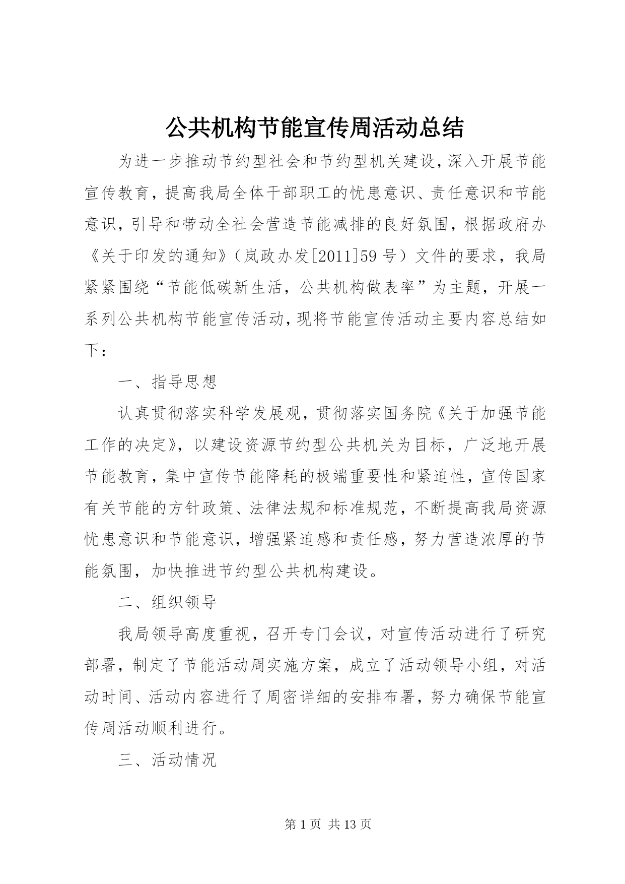 第PAGE\*Arabic\*MERGEFORMAT13页共NUMPAGES\*MERGEFORMAT13页公共机构节能宣传周活动总结为进一步推动节约型社会和节约型机关建设,深入开展节能宣传教育,提高我局全体干部职工的忧患意识、责任意识和节能意识,引导和带动全社会营造节能减排的良好氛围,根据政府办《关于印发的通知》(岚政办发[2011]59号)文件的要求,我局紧紧围绕“节能低碳新生活,公共机构做表率”为主题,开展一系列公共机构节能宣传活动,现将节能宣传活动主要内容总结如下:一、指导思想认真贯彻