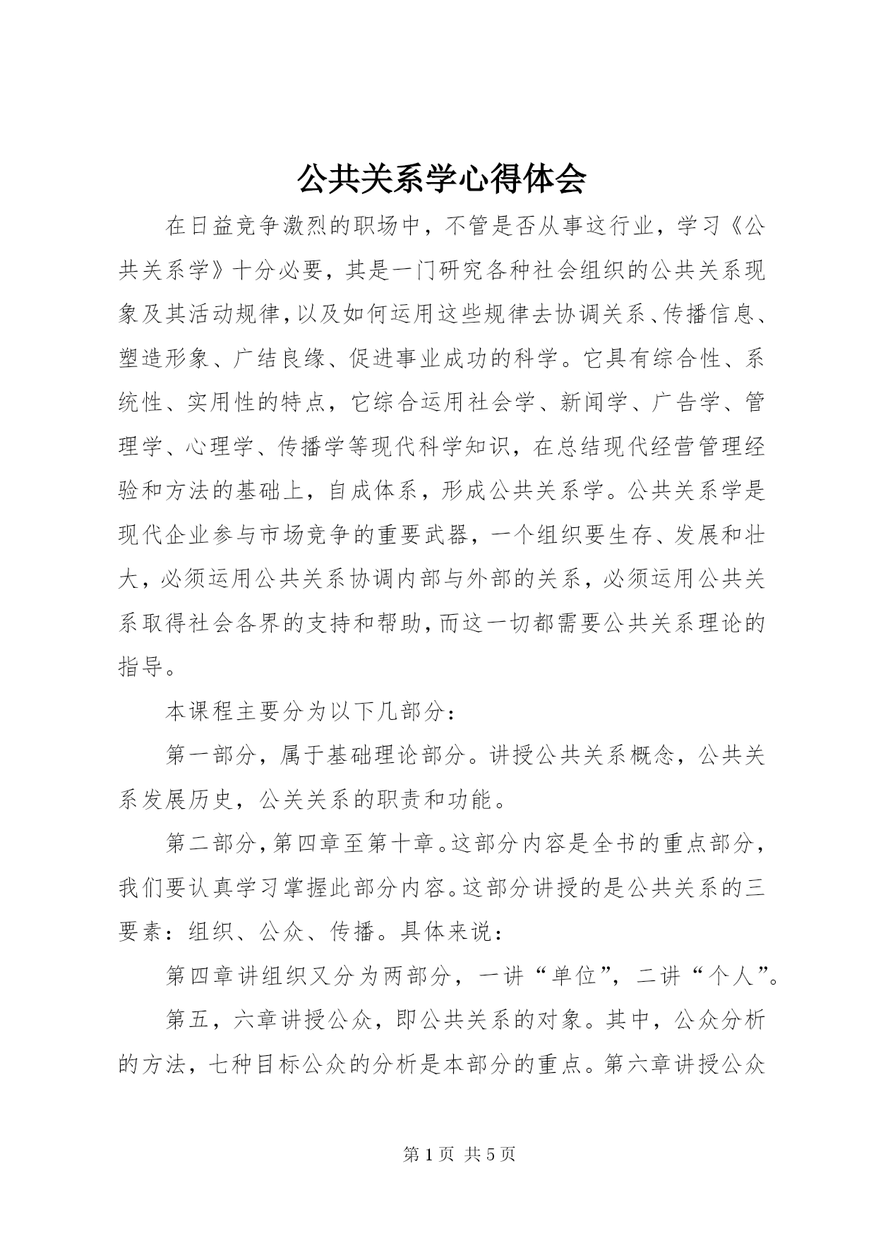 第PAGE\*Arabic\*MERGEFORMAT5页共NUMPAGES\*MERGEFORMAT5页公共关系学心得体会在日益竞争激烈的职场中,不管是否从事这行业,学习《公共关系学》十分必要,其是一门研究各种社会组织的公共关系现象及其活动规律,以及如何运用这些规律去协调关系、传播信息、塑造形象、广结良缘、促进事业成功的科学。它具有综合性、系统性、实用性的特点,它综合运用社会学、新闻学、广告学、管理学、心理学、传播学等现代科学知识,在总结现代经营管理经验和方法的基础上,自成体系,形成公共关系学