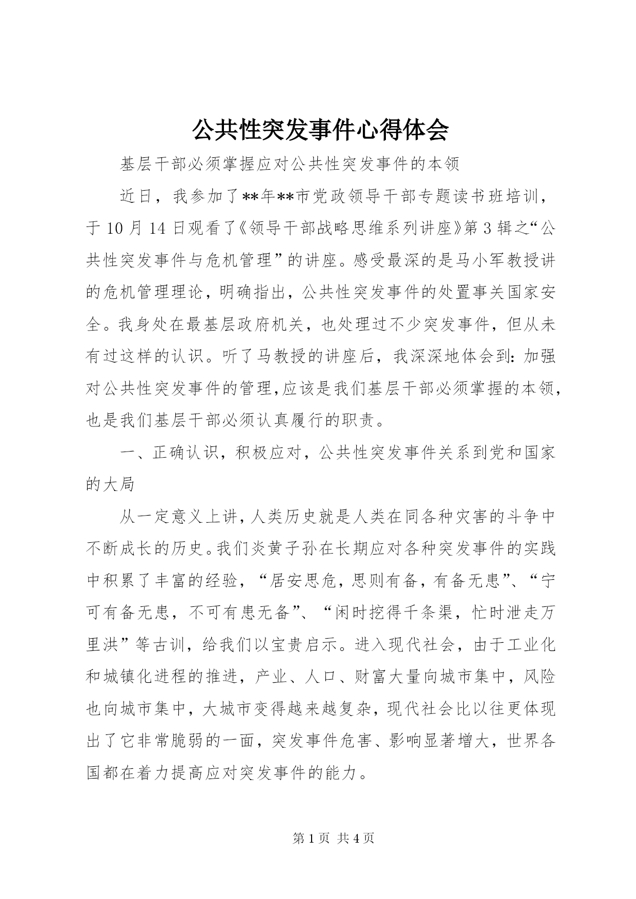 第PAGE\*Arabic\*MERGEFORMAT4页共NUMPAGES\*MERGEFORMAT4页公共性突发事件心得体会基层干部必须掌握应对公共性突发事件的本领近日,我参加了**年**市党政领导干部专题读书班培训,于10月14日观看了《领导干部战略思维系列讲座》第3辑之“公共性突发事件与危机管理”的讲座。感受最深的是马小军教授讲的危机管理理论,明确指出,公共性突发事件的处置事关国家安全。我身处在最基层政府机关,也处理过不少突发事件,但从未有过这样的认识。听了马教授的讲座后,我深深地体会到