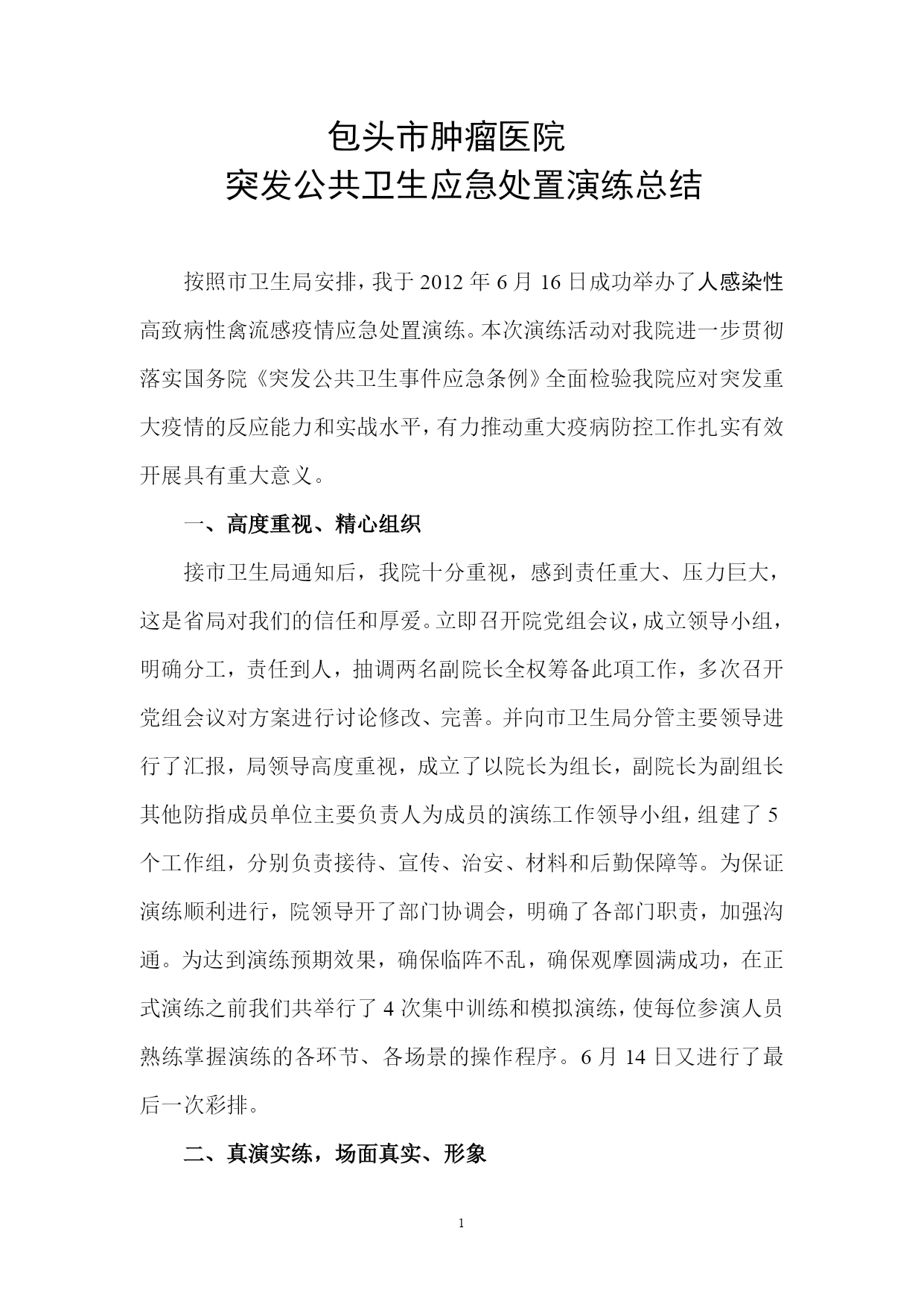 包头市肿瘤医院突发公共卫生应急处置演练总结按照市卫生局安排,我于2012年6月16日成功举办了人感染性高致病性禽流感疫情应急处置演练。本次演练活动对我院进一步贯彻落实国务院《突发公共卫生事件应急条例》全面检验我院应对突发重大疫情的反应能力和实战水平,有力推动重大疫病防控工作扎实有效开展具有重大意义。一、高度重视、精心组织接市卫生局通知后,我院十分重视,感到责任重大、压力巨大,这是省局对我们的信任和厚爱。立即召开院党组会议,成立领导小组,明确分工,责任到人,抽调两名副院长全权筹备此項工作,多次召开党组会议对