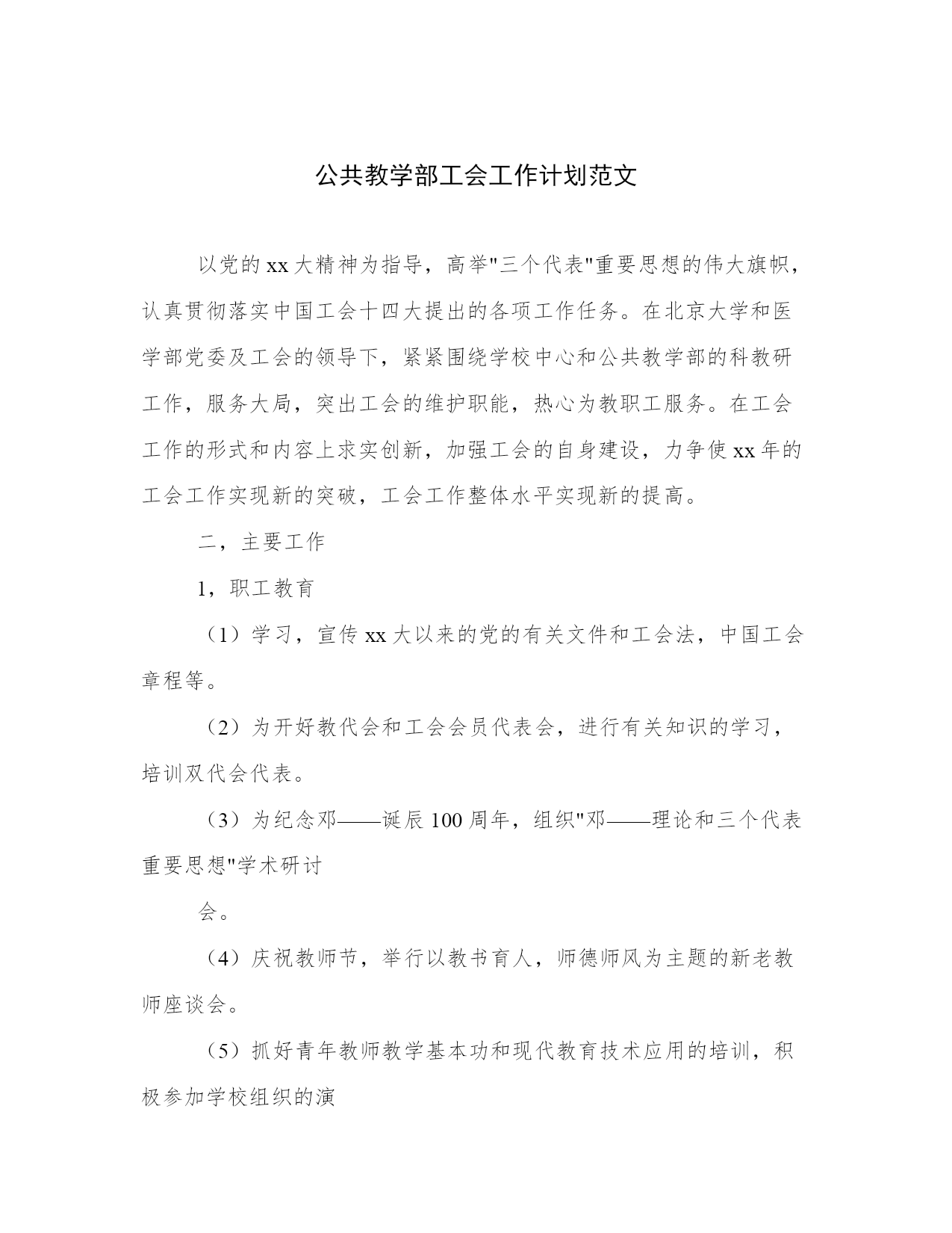 公共教学部工会工作计划范文以党的xx大精神为指导,高举"三个代表"重要思想的伟大旗帜,认真贯彻落实中国工会十四大提出的各项工作任务。在北京大学和医学部党委及工会的领导下,紧紧围绕学校中心和公共教学部的科教研工作,服务大局,突出工会的维护职能,热心为教职工服务。在工会工作的形式和内容上求实创新,加强工会的自身建设,力争使xx年的工会工作实现新的突破,工会工作整体水平实现新的提高。二,主要工作1,职工教育(1)学习,宣传xx大以来的党的有关文件和工会法,中国工会章程等。(2)为开好教代会和工会会员代表会,进行